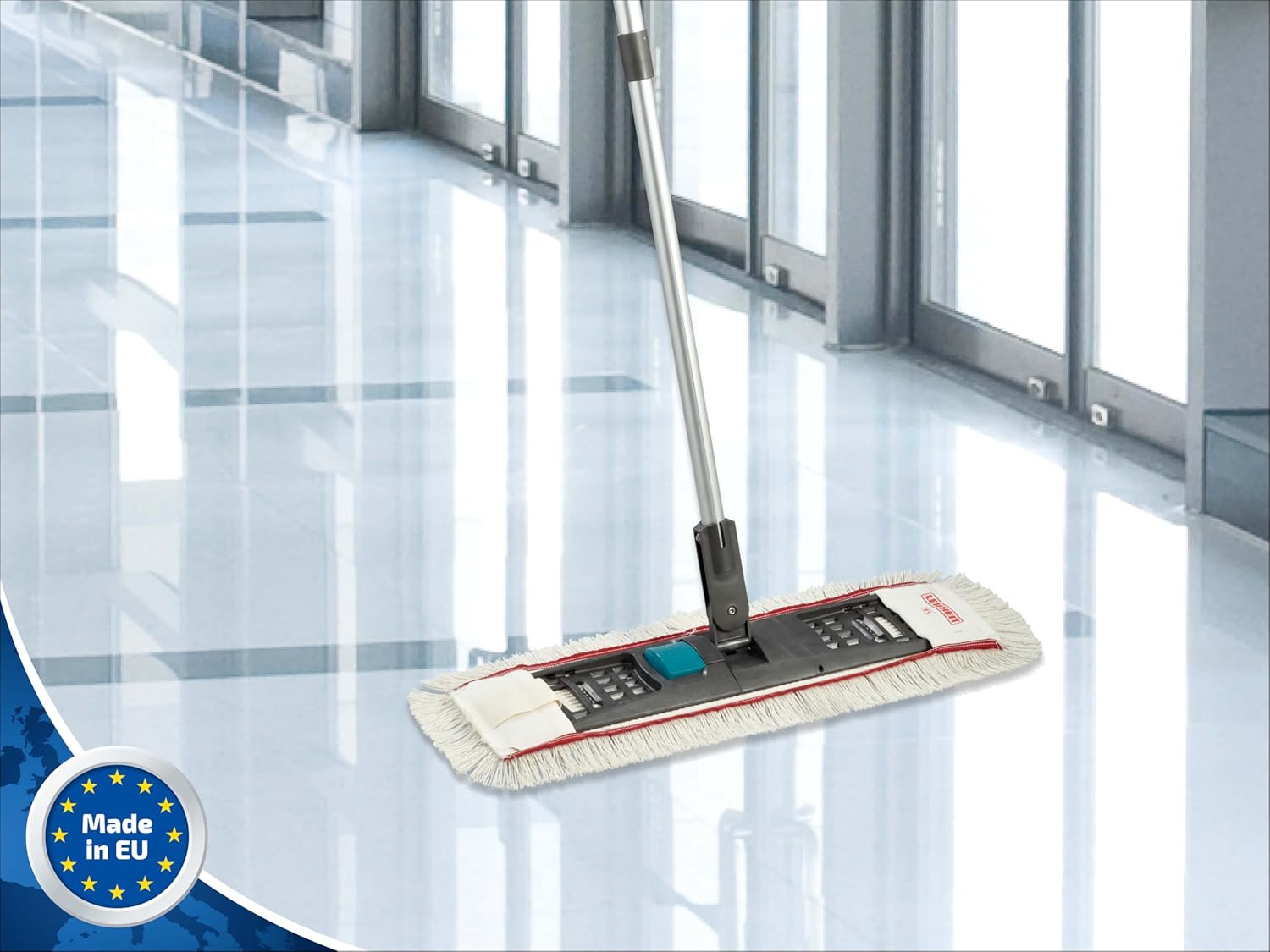 No bending down to remove the wiper cover; no hands in the dirty water; perfect cleanliness even in case of coarse dirt: Leifheit Professional flat wiping system makes the cleaning of restaurants, offices and shops easier, quicker and more efficient. A patented foot-operated pushbutton allows the easy releasing of the Tuft wiper cover while standing. Thanks to a fixation tape the wiper cover can be pressed with the hand lever press in the separately available Leifheit cleaning cart – without hands in the dirty water. A 360° rotating joint on the handle makes the cleaning of hard to reach areas on stairs, in corners or under armoires easier. The telescopic handle is extendable from 41 up to a length of 69 inches. Thanks to a right/left locking it can easily be operated with only one hand. The anti-slip safeguard on the end of the grip prevents the handle from falling over when it is leaned on the wall. Leifheit flat wiping system is developed, tested and produced in Germany. Leifheit guarantees for 5 years.