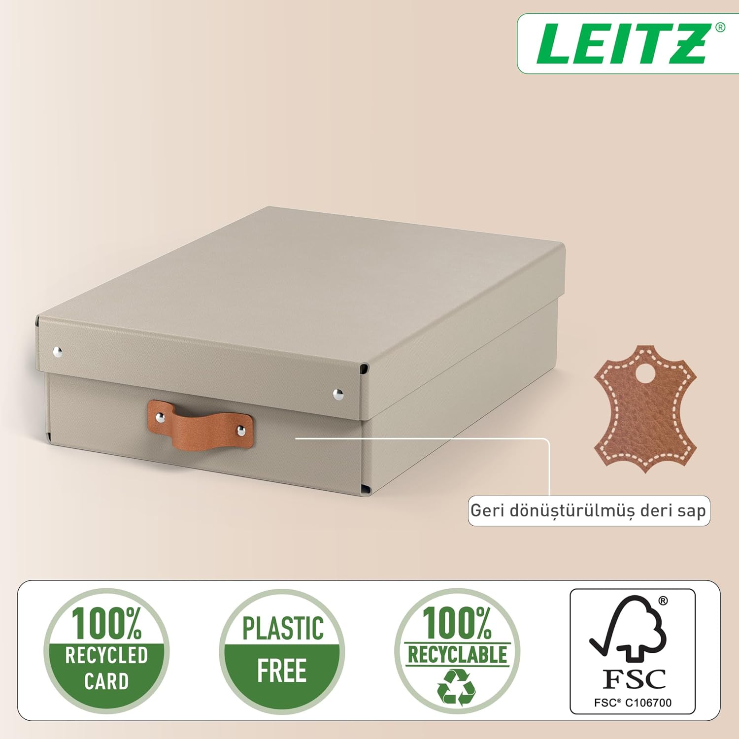 Stay organised and stylish with the Leitz Medium Low Puro Storage Box with Lid, to create instant storage. Made from 100% recycled FSC certified cardboard, this set of two small storage boxes with lids offers a 8-litre capacity, to store A4 documents, 14'' laptops, hobby and craft supplies. The high-quality, stackable design ensures durability and space-saving efficiency, while the leather pull handle adds a touch of elegance and ease of access. Available in a range of calm, earthy colours, these boxes complement any interior decor. Ideal for use in cube furniture units, shelves, and standard drawers, they come flat-packed in plastic-free packaging and are easy to assemble without tools. FEEL GOOD with Leitz.