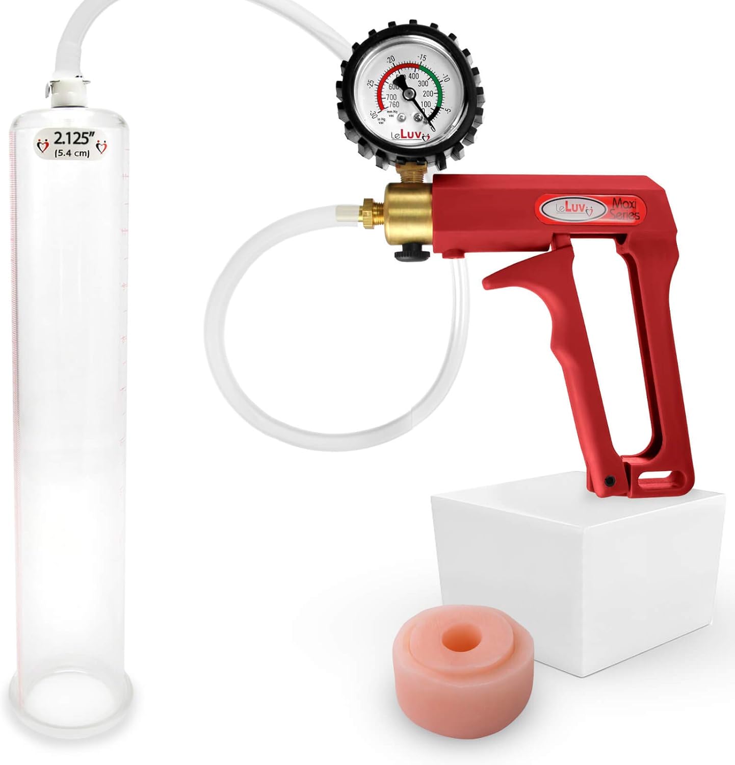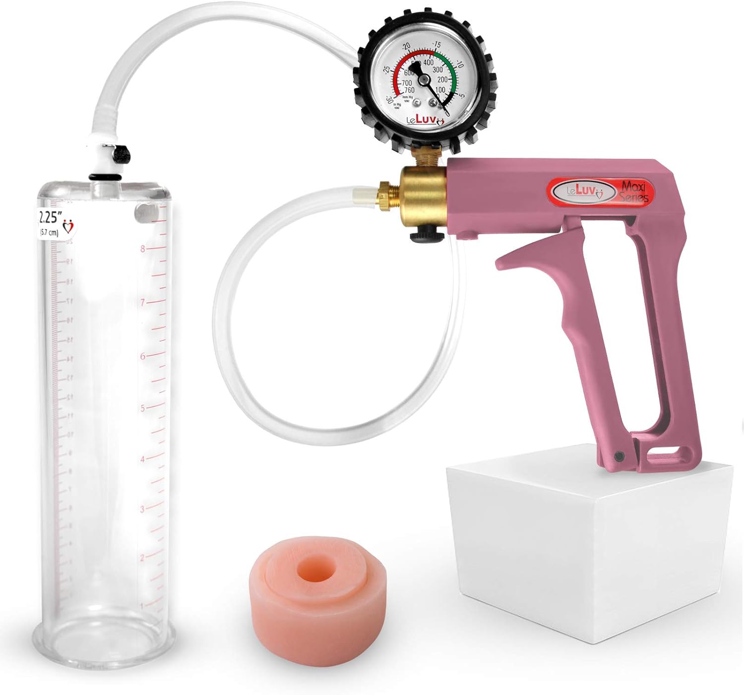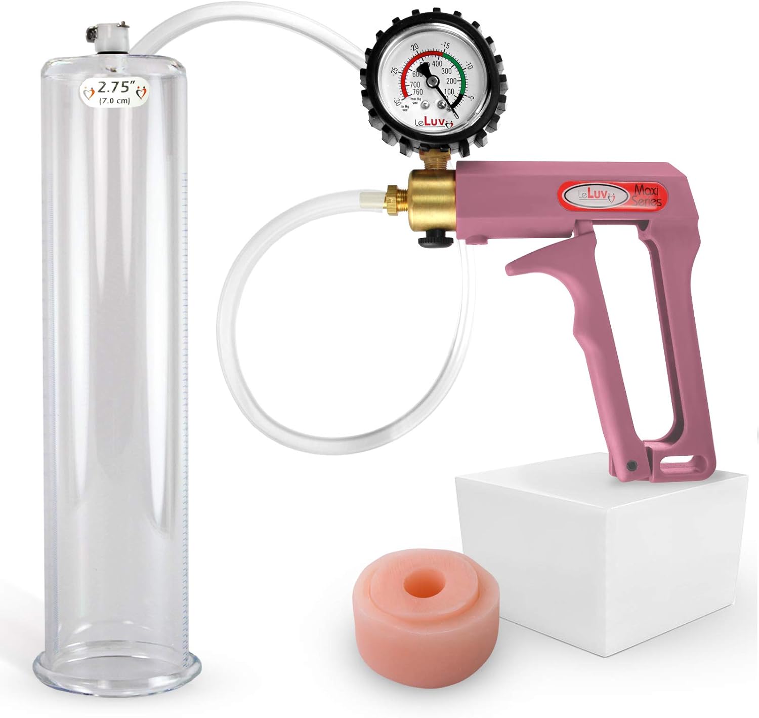 Bundle of 2 items: LeLuv Maxi Penis Vacuum Pump with Blue Handle & Soft Silicone Donut Seal. The LeLuv Maxi penis pump creates an immediate, powerful suction, while the ergonomically designed nylon handle is lightweight and easily used one-handed. It's safety vacuum release valve is easy to operate. We include 18 inches of kink-resistant hose, and our specially-designed Quick-Disconnect Fittings to offer trouble-free pumping sessions. You can even disconnect the hose from the cylinder and it will maintain vacuum! Specially designed to be used with or without any sleeve, the extra-thick clear, seamless, untapered cylinder is graduated in both inches and centimeters up the side. For beginners, it is important to start the pumping process slowly to avoid discomfort. Remember to use the quick release valve if the vacuum becomes too severe. Continue pumping/releasing air until you've found a suitable level of vacuum. The penis should look swollen but should not hurt. Keep an appropriate amount of vacuum on your penis and wait 20 minutes. Once the session is complete, clean the cylinder and any accessory with warm water or arcrylic/silicone-safe cleaner. Let dry before storing.