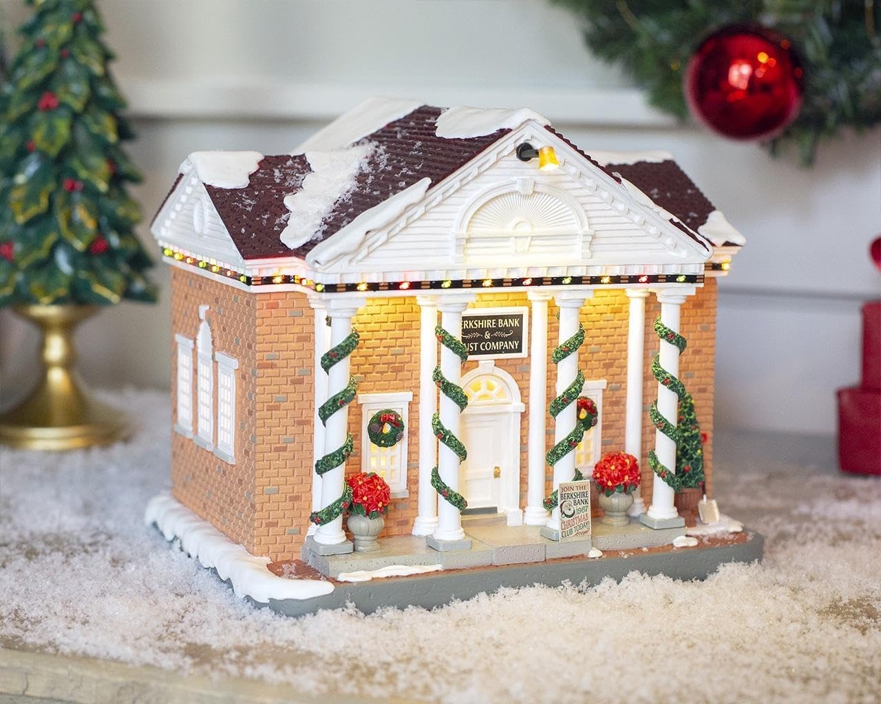 Berkshire Bank & Trust Company is a classic red-brick bank. Its four towering white columns are wrapped in garland for the holiday season, with poinsettias and a Christmas tree decorating the snowy front stoop. For 2023, Lemax has partnered with the Norman Rockwell Museum to bring you an exclusive once-in-a-lifetime representation of the famous painting "Home For Christmas" by the American painter and illustrator Norman Rockwell. These unique lighted buildings will add warmth and charm, creating an amazing and unique nostalgic feeling for your Holiday Village. Featuring charming architecture, bustling sidewalks, and Christmas lights reflecting on freshly fallen snow, this painting wonderfully captures the essence of Christmas in a small town. This makes Home For Christmas the perfect inspiration for the newest Lemax Christmas Village collection.