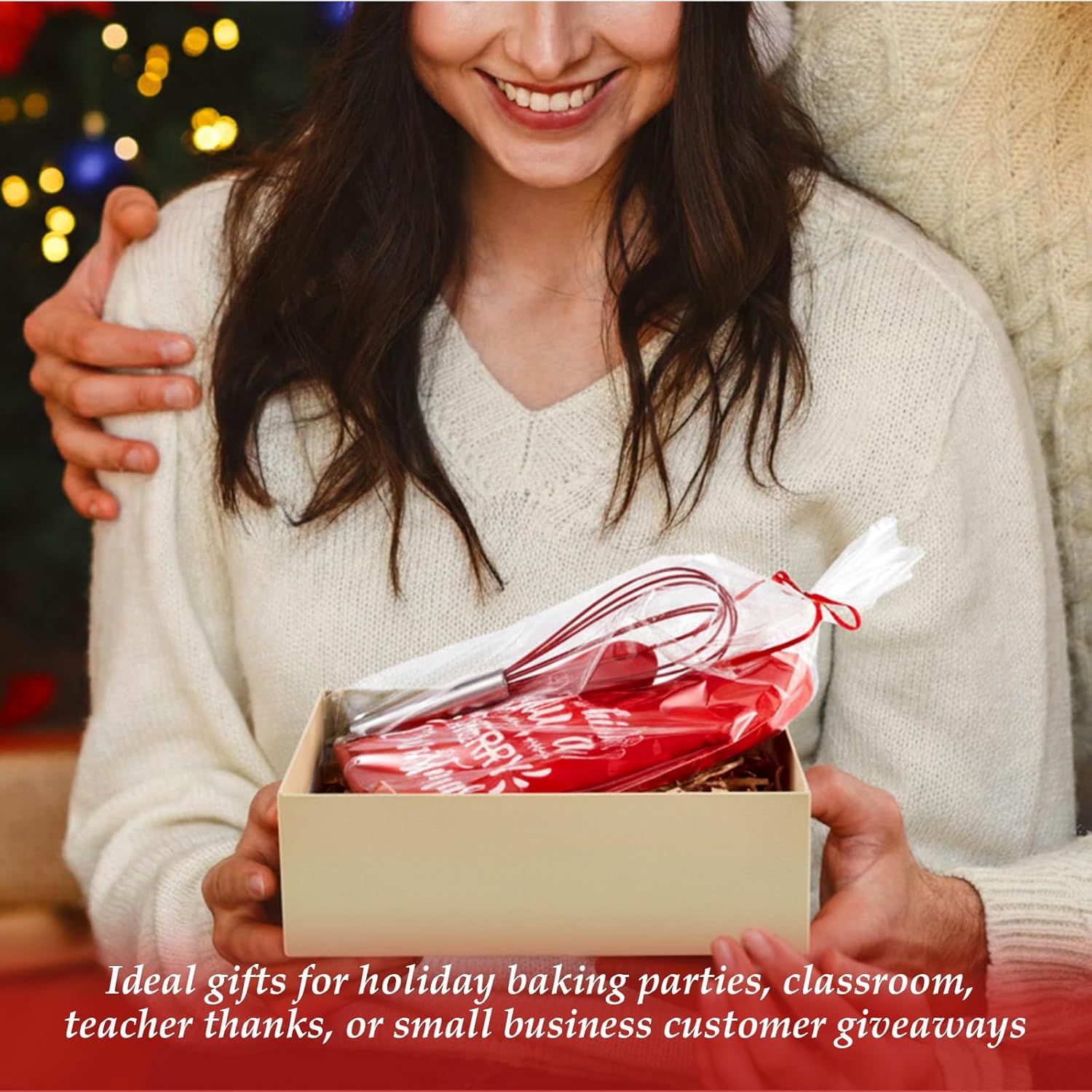 Features: Versatile Kitchen Tool: The Christmas baking whisks work well for those robust mixing tasks, which can not only be applied for beating eggs, but also to stir pancake batter in a bowl and mix small amounts of ingredients. Easy to Clean Storage: The Christmas baking set is easy to clean, just rinse with water. The stainless steel structure is not easy to rust, and silicone is safe for use. Specifications: Material: cotton, silicone, stainless steel, paper, plastic Color: red Size: Oven mitts: 10.6 x 6.7 inches / 27 x 17 cm Whisks: 10 inches / 25.4 cm Cards: 2 x 2 inches / 5 x 5 cm Ribbon: 5 meters / 16.4 ft Bags: 9.8 x 15.7 inches / 25 x 40 cm Package includes: 12 x Red silicone whisks 12 x Red pot holder with pocket 12 x Greeting cards 1 x Red ribbon 12 x Plastic bags Notes: Manual measurement, please allow slight errors on size. The color may exist a slight difference due to different screen displays