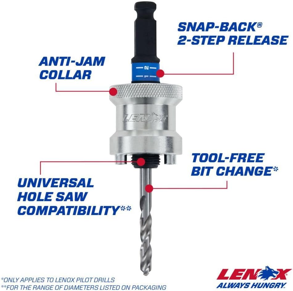 The LENOX SNAP-BACK Quick Change Hole Saw Arbors Feature Tool-Free Saw and Pilot Bit Change For Productivity. The 2-Step Design Releases The Saw And Pilot Bit Without Requiring Additional Tools. The Collar Snaps Into Each Position, to Allow For Single-Handed Operation, and Is Reinforced To Stay Engaged While Drilling. LENOX SNAP-BACK Quick Change Arbors Are Universally Compatible With All Threaded Hole Saws And Do Not Require Adapters For Use. (Only applies to LENOX Pilot Drills) - For the Range of Diameters Listed On Packaging..