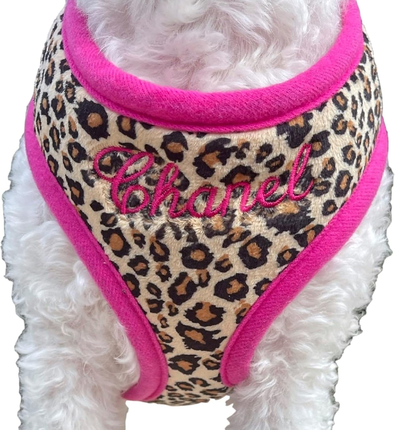 Please measure accurately before you buy as custom goods are not returnable. We offer discounted REDO's for those who guess and get it wrong because we support our Buyers so you can buy with confidence! Dog harness styles are all different so DO NOT guess on the size!EASY SIZE INSTRUCTIONS: Measure your pet's neck & chest BEFORE YOU BUY and ensure these two measurements fall within the numbers listed in the size chart and as a precaution ensure the head is at least the same size as the neck so that the neck opening can slide over the head. If your measurements fall at the end, go up one. Message the Seller for help before you buy. Why Harnesses are a Safer Choice: Nobody can fully understand the meaning of love unless he’s owned a dog. A dog can show you more honest affection with a flick of his tail than a man can gather through a lifetime of handshakes but dog harnesses have several benefits over traditional collars & pet owners who have made the change have not looked back! For dogs that pull, a harness spreads the load around the body and reduces strain on the neck & back, this is especially beneficial for small breeds & puppies. Collars can also restrict a dog's breathing, you may have heard this during dog walking, if your dog pulls. The SASSY DOG FASHIONS personalized walking harness is the perfect flare for your dog and there is an option to add a blank or personalized leopard leash. Sizes XS, S, M, L and XL for small to medium & certain large dogs AND PUPPIES such as yorkies, chihuahua, all size poodles, doodles, labrador, beagles, bichons, shih tzu, maltese, papillon, spaniels, terriers & more. See size chart to ensure your dog fits.