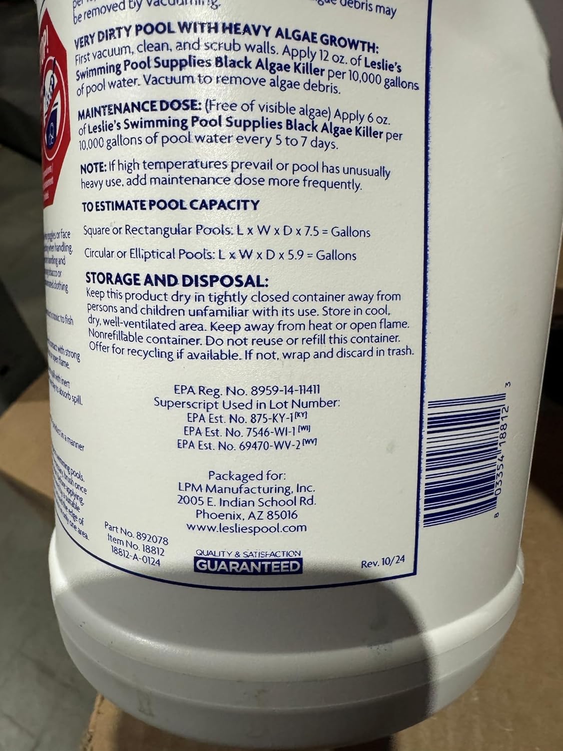 Black algae is one of the most difficult varieties to control and eliminate. This algae can appear as a blackish discoloration or a tar-like deposit. In either case, it is a problem to remove because of the physical nature of this algae. Leslie's Black Algae Killer eliminates and prevents Black Algae. Visible Algae Growth Dosage: 12 ounces per 10,000 gallons of water. Leslie's Black Algae Killer controls the growth of algae in swimming pools. Brush algae spots prior to application. If necessary, brush once each day for two days following application. Before applying, adjust pool water pH to 7.2-7.8 as determined by a suitable test kit. Apply this dosage into the water around the edge of the pool. Do not concentrate the application in only one area.