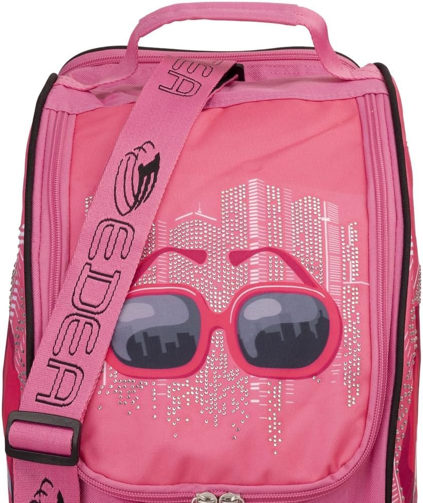 SIGNORINA SKATE BAG Signorina, for those looking for style! The Signorina skate bag features a soft pink design with a crystallized city skyline composed of over 3000 crystals and a set of crystal earrings, making it the perfect choice for those looking to shine in style. This shaped bag is designed to carry a pair of skates. It is made of thick, tear-resistant polyester for durability and easy to wash for easy maintenance. Its matte, smooth finish prevents dirt from sticking together. The internal base is rigid with a moisture wicking cover on one side (for ice skates) and a completely smooth side for easy cleaning (for roller skates). This internal base is completely removable for easy washing. Inside, there is a side mesh pocket for storing small items such as a pair of spare shoelaces, a pair of shoelaces, a shoelace puller and socks. Inside the bag with jacquard shape. A second large back pocket for gear and a second open pocket for easy access. Drainage hole at bottom to keep boots cool and studded base to keep contents dry. Adjustable shoulder strap and padded handle for easy carrying.