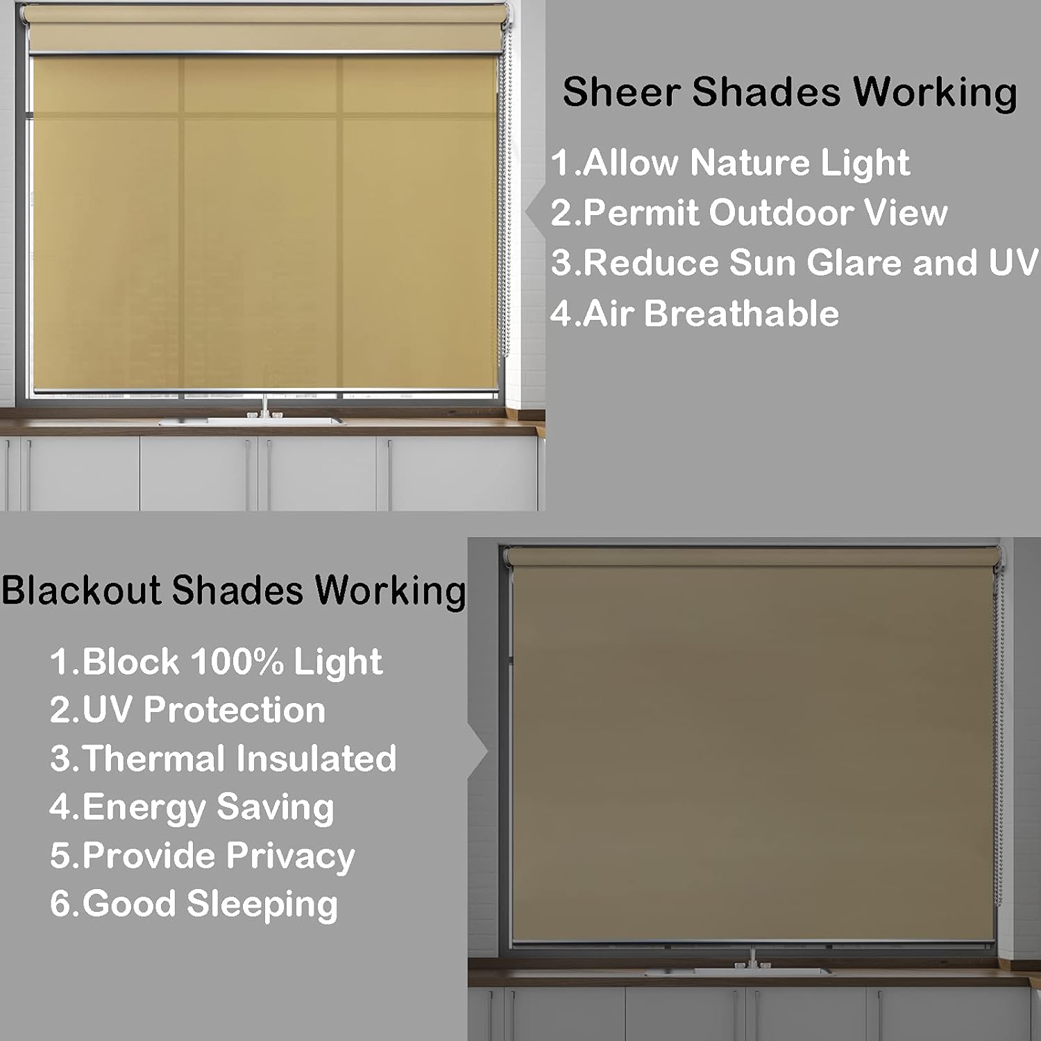 MOUNT TYPES: Inside mounted shades will have a deduction taken of approximately 1/4" to ensure a proper fit inside the window frame.Inside mounted shades require a minimum frame depth of 4inch for secure installation. If your window frame depth is less than 2.5inch please select outside mount.Outside mounted shades should be ordered with the exact width of the area you wish to cover. Outside mounts are often used when there is not sufficient frame depth for inside mounting.Our shades come with all mounting hardware, and mounting hardware for both inside mount and outside mountINSIDE MOUNT MEASUREMENT: Step 1.Measure the inside frame width at three locations-the top,middle,and bottom. remark the smallest of the 3 measurements and use that number deduct 1/4inch as your inside width when ordering.Step 2. Measure the height at 3 locations-the left,middle,and right side. remark the smallest of the 3 measurements and use the number as your inside width when ordering.OUTSIDE MOUNT MEASUREMENT: Step 1. Measure the outside frame width adding 6-10inch to be the outside mount width.Step 2. Measure the outside frame length adding 5-10inch to be the outside mount length. The overlap it recommended to allow appropriate coverage and avoid any light gaps.Type: Solid color roller shade.Feature: Thermal Blackout Waterproof Material: Polyester FabricInstallation: All Mounting Hardware Included.