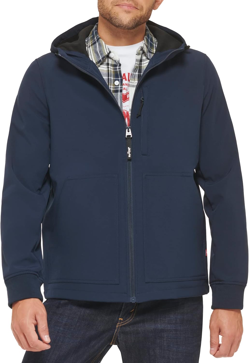 STYLISH FEATURES: Clean look hoody with Levi's logo front zipper pull, Levi's red tab logo at lower left seam, soft rib knit cuffs for comfort. FUNCTIONALITY: Center front zipper closure, two large lower pockets, attached hood with adjustable draw cords. WARMING FEATURES: Outer shell is water and wind resistant.