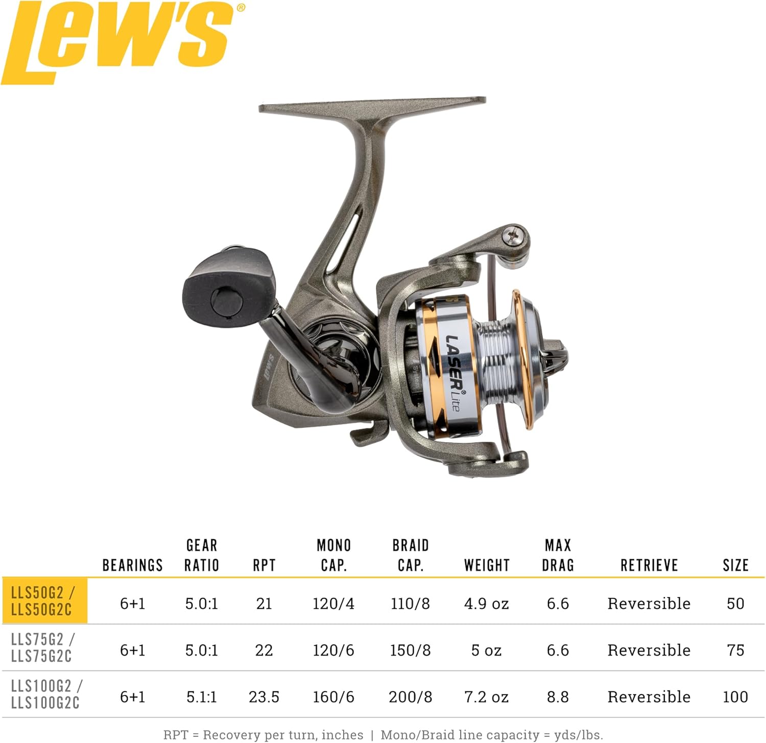 | Model Name | Lew’s Laser Lite Spinning Fishing Reel, 6+1 Bearings, Graphite Frame and Sideplate, Speed Lube, Multi-Disc Drag, Metallic Gray/Silver/Gold |