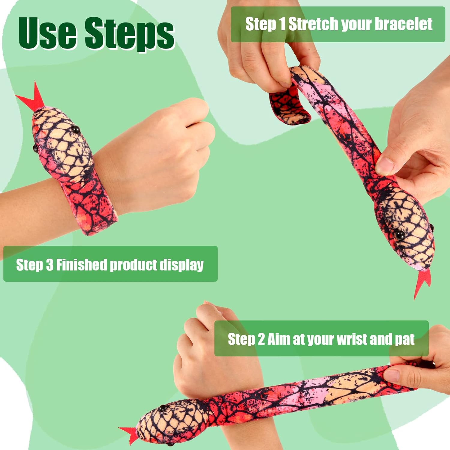 Features: Bring you happiness: These kid snap bracelets can be widely applied in snake theme birthday parties, zoo theme parties, jungle theme parties, Halloween parties, carnivals, stage shows and other occasions to increase the party atmosphere and leave a deep impression on your friends and guests. Considerate presents: You can share these snake snap bracelets with your daughters, sons, brothers, daughter, nephews, nieces, friends, and family members, to give them a surprise and express your love and care. Specifications: Material: polyester Quantity: 30 pieces Color: as the pictures show Size: approx. 30 cm/ 11.8 inches in length Package includes: 30 x Snake snap bracelets Notes: Manual measurement, please allow slight errors on size. The color may exist a slight difference due to different screen displays. Suitable for people over 12 years old. Winding risk may exist, please keep away from children.