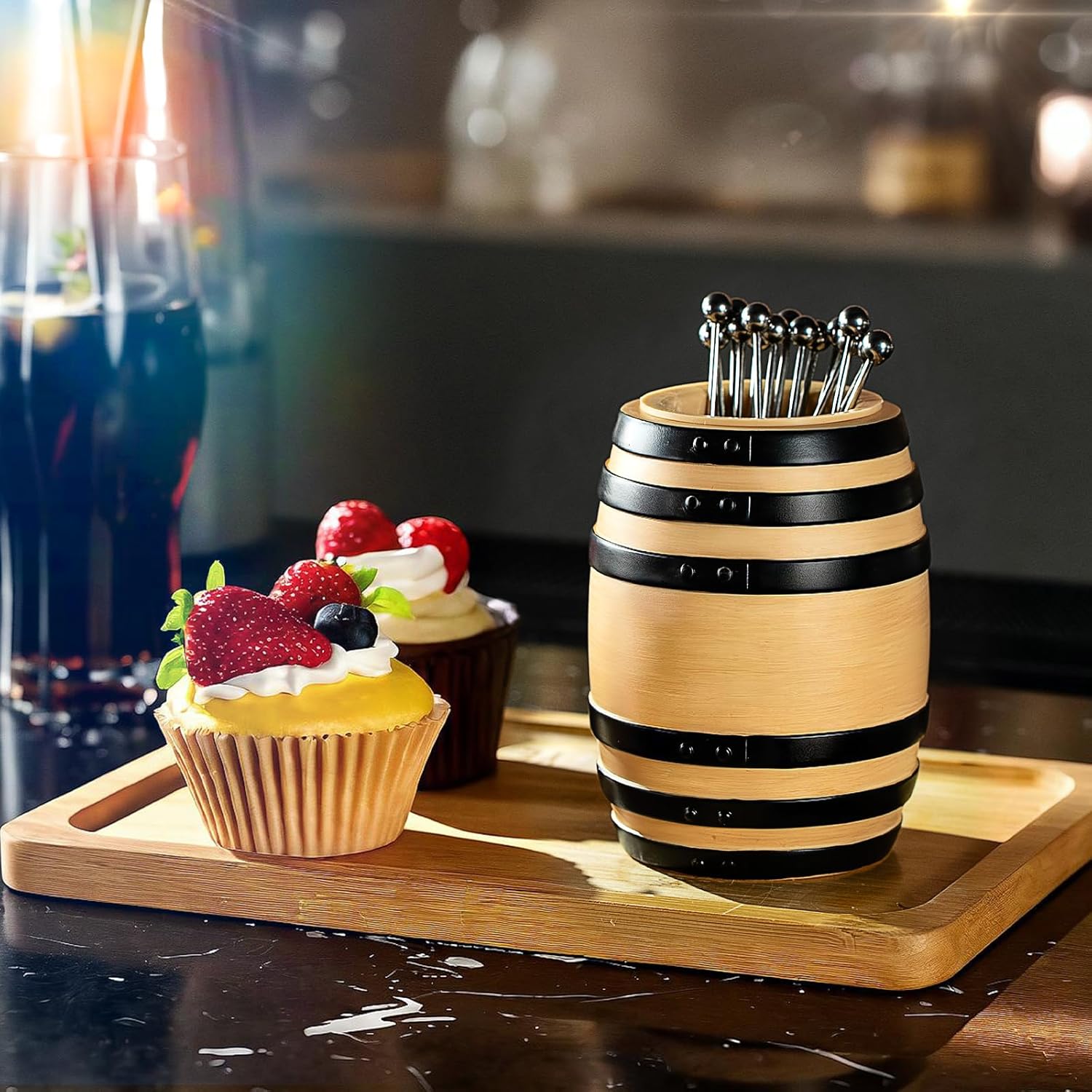 Double the Style — One Classic, One Playful This cocktail pick bundle brings together two distinctive designs — the stainless steel holder for a modern, minimal bar aesthetic, and the wood barrel holder with black rings for a warm, vintage touch. Both sets feature durable stainless steel picks topped with polished ball heads — ideal for garnishing cocktails, fruits, olives, or desserts. Whether you’re hosting a cocktail night or looking for a thoughtful gift, this duo set combines elegance and fun, adding both style and function to your home bar.