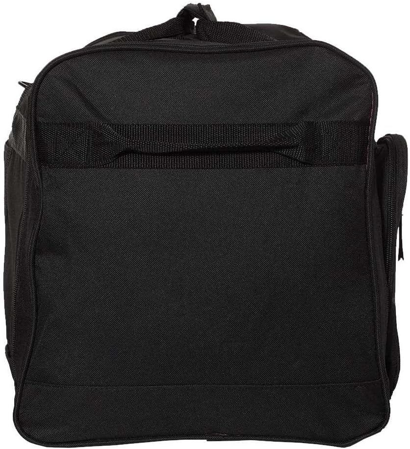 ● 600 denier polyester ● Trim and lining on bottom is 600D, sides/tops not lined but PU coated ● Multi pocket duffle ● U-shaped opening in main compartment ● 2 large side pockets with zipped down feature for easy packing and access ● Adjustable, detachable padded shoulder strap ● Large gusset front pocket with inside pockets ● Black contrasting polyester webbing ● Quick close handle ● 27 " x 13 " x 14" ● Non-branded label/tag
