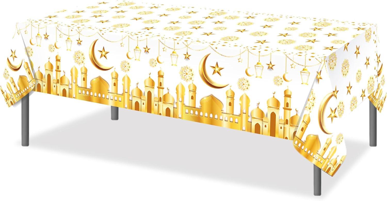 2 Pcs Plastic Ramadan Mubarak Party Tablecloth, Eid Mubarak Table Cover Disposable Ramadan Mubaraks Table Cloth for Eid Theme Party Decorations, 54x87In