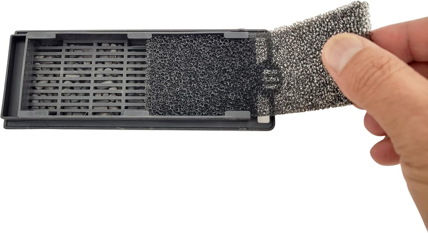 A Multi-Stage Filter with (Replaceable) Multi-Stage Filter Cartridges The Lifegard Aquatics Hang on the Side Filters HOF Series uses proprietary replacement filter cartridges that are sold in packages of two (Part # R460110). Each filter chamber has grooves on each side that act as guides for Lifegard’s filter cartridges to slide perfectly into. Press the cartridge from the top so it pushes downward all the way in for a snug fit. Lifegard Aquatics filter cartridges will satisfy the filtration needs for most aquarists. Because the cartridges were designed specifically for our hang-on filters, water does not flow alongside, around, or underneath—but through them. We meticulously engineered our filters so that water does not bypass the media. Water touches the entire surface area of each cartridge so their lifecycle is substantially longer. Users will appreciate the fact that they won’t have to buy and change media as often as they would with other hang-on power filters in this class. Get more bang for your buck with a filter constructed to suck up more muck and nasty junk. You may be familiar with the concept of multi-stage filtration. This term is often used to describe the physical attributes of an aquarium filter, such as the interior design of a canister filter. A manufacturer might describe the filter as a 3-stage filter because inside the canister are 3 trays (or “stages”) that can be used for different filtration modalities, the most popular being biological, mechanical, and chemical filtration. Understanding the basics of multi-stage filtration is important. Because once you do, you’ll see the unique advantages that Lifegard Aquatics Media Cartridges offer just as crystal clear as your aquarium water will be when using a Lifegard Aquatics HOB Filter. Look closely and you will see that each filter cartridge provides 3-stages of filtration all on its own! Let’s take a closer look: Stage ① BIOLOGICAL➕ FILTRATION 2-in-1 biological + mechanical filtration: Pores in the sponge are perfectly sized for beneficial bacteria to colonize. A 40-micron removable sponge filter traps large debris. Stage ② CHEMICAL➕ FILTRATION 2-in-1 chemical + biological filtration: Activated carbon removes dangerous toxins. It also creates a safe zone for beneficial bacteria to cultivate and create a natural bio-filter. Stage ③: MECHANICAL A 20-micron filter pad traps small debris and free-floating particles from aquarium water such as uneaten food, dust, detritus, and other organic waste that fouls water quality.