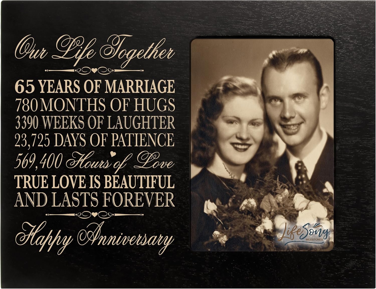 Honor the happy couple with a personalized 65th wedding anniversary photo frame. A treasured and lasting personal keepsake for wedding or anniversary. 65th Anniversary picture frame can be hung on wall or displayed on table. This special keepsake anniversary gift will always be a wonderful reminder of the love that you have for one another. Honor the happy couple with a 65th wedding anniversary decorative wood photo frame holds 1- 4x6 photo. Words are laser engraved.