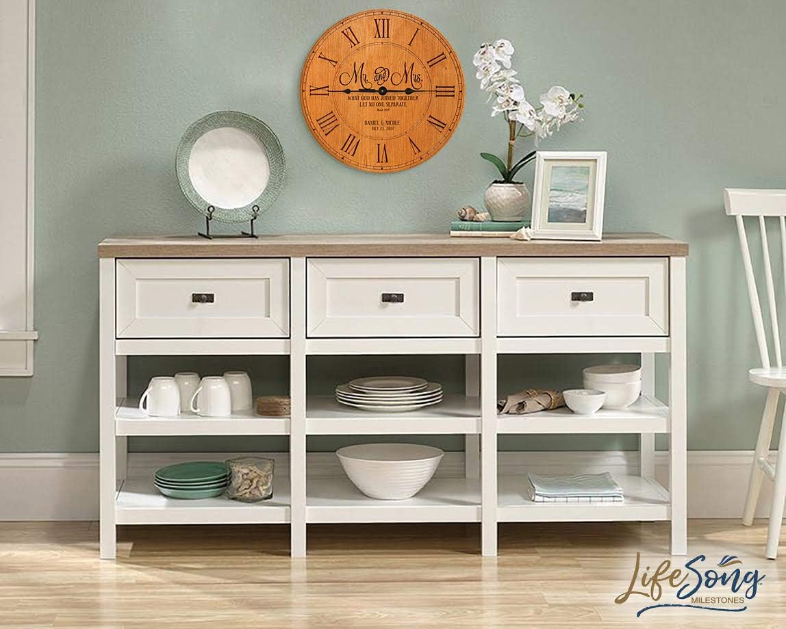 Personalized wedding or anniversary clock shows off a keepsake wedding day memory, elegantly engraved with scripted bride and groom name and wedding date. Crafted in the USA for wall or tabletop display; clock 12"x 12"x 1.5". Quality gift for wedding or anniversary; decorator accent that is functional and inspiring. Personalization is included in the price of the clock and includes one line of script for the names and one line of print font for the date.