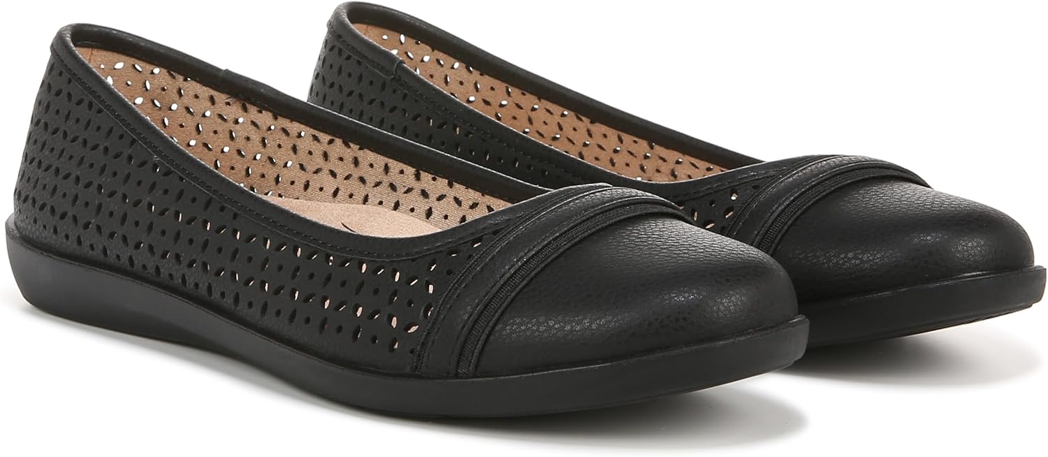 Support meets style in these classic ballet flats with exceptional arch support. Faux leather upper with a round toe, slip-on fit, decorative cutout accents, strap detail at the toe, soft fabric linings, and lightweight and flexible design. Linings, toe box, and heel counter crafted from partially recycled materials. Soft System® comfort package provides all-day support, flex, and cushioning. Active Arch® contoured insole with extra arch support and cushioning. Traction sole for extra stability. Just Right Height 7/8 inch sole.