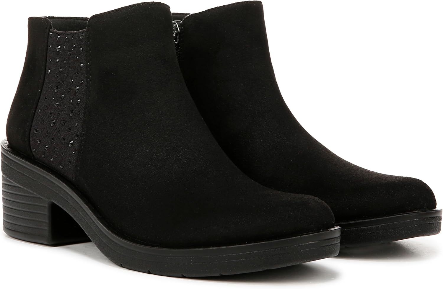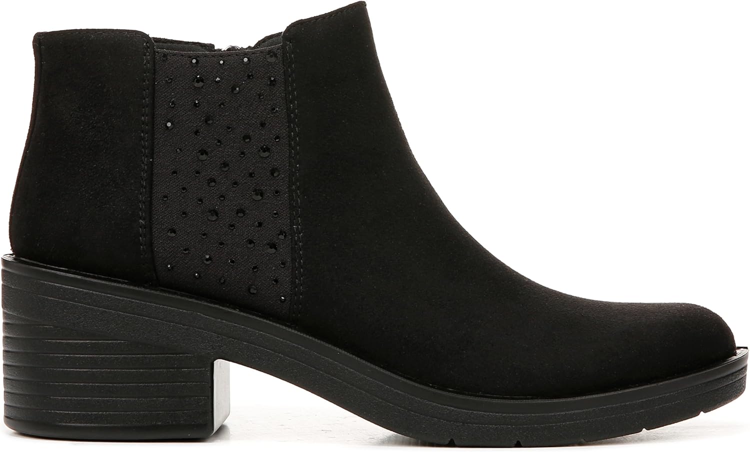 Experience 10 out of 10 comfort with these boots! Sparkly details make these stand out from your typical ankle bootie. Stretch fabric upper with partially recycled linings and topcloth with a round toe. Side zipper and rhinestone details. BLOOM™ materials: Eco-conscious algae-infused foam layer under the insole. BZEES Air Step Technology: Designed so you’ll feel weightless, energized and free. Ultra Lightweight: Step lightly with a nearly weightless feel. Dynamic Stretch Fabrics: Move freely in shoes with built-in stretch. FreeFoam™ Comfort: Low pressure insoles with maximum foot contact and cushy arch support. ComfortBlast Foam: Our most premium foam with unbelievable rebound, luxe cushioning, and comfort that never quits. Odor Control technology. 3.03 inch boot height, 10.24 inch leg circumference. 2 3/8 inch block heel. EVA outsole. Get Width It: Countless pairs of Bzees come in wide width shoes for women. Machine Washable: Wash on cold and air dry.