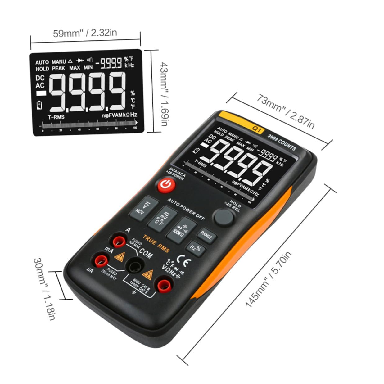 Package List 1 x Multimeter Characteristics - DC current: 9.999μA(0.001μA)/999.9μA(0.1μA)±(0.8%+3), 999.9mA(0.1mA)/9.999A(0.001A)±(1.0%+3) ampere measurement - current(40Hz-1kHz): 9.999μA(0.001μA)/999.9μA(0.1μA)±(1.0%+3), 999.9mA(0.1mA)/9.999A(0.001A)±(1.2%+3) voltmeter - voltage(40Hz-1kHz): 9.999mV(0.001mV)/99.99mV(0.01mV)/999.9mV(0.1mV)/9.999V(0.001V)/99.99V(0.01V)/750V(0.1V)±(1.0%+3) digital multi meter - Frequency: 99.99Hz(0.01Hz)/999.9Hz(0.1Hz)/9.999kHz(0.001kHz)/99.99kHz(0.01kHz)/999.9kHz(0.1kHz)/5.000MHz(0.001MHz)±(0.1%+2) resistance measurement - Display: 9999 Counts -Product Info:Digital multimeter - Capacitance: 9.999nF(0.001nF)±(5.0%+20), 99.99nF(0.01nF)/999.9nF(0.1nF)/9.999μF(0.001μF)/99.99μF(0.01μF)/999.9μF(0.1μF)±(2.0%+5), 9.999mF(0.001mF)±(5.0%+5) - Size: 14.5x7.3x3cm - Support: Diode Testing, NCV, , Continuity Testing, backlight, Indication data hold and auto . - Material: ABS and TPE - DC voltage: 9.999mV(0.001mV)/99.99mV(0.01mV)/999.9mV(0.1mV)/9.999V(0.001V)/99.99V(0.01V)/999.9V(0.1V)±(0.5%+3) - Color: Orange - Temperature: (-20~1000)℃(1℃)/(-4~1832)℉(1℉)±(2.5%+5)Goods Descriptionvoltmeter This meter is a stable, safe and reliable multimeter.resistance measurement It's a portable and tool for users.voltage measurement It support Diode Testing, NCV, , Continuity Testing, backlight, Indication data hold and auto .digital multi meter The meter measures voltage, current, capacitance, frequency, temperature and resistance