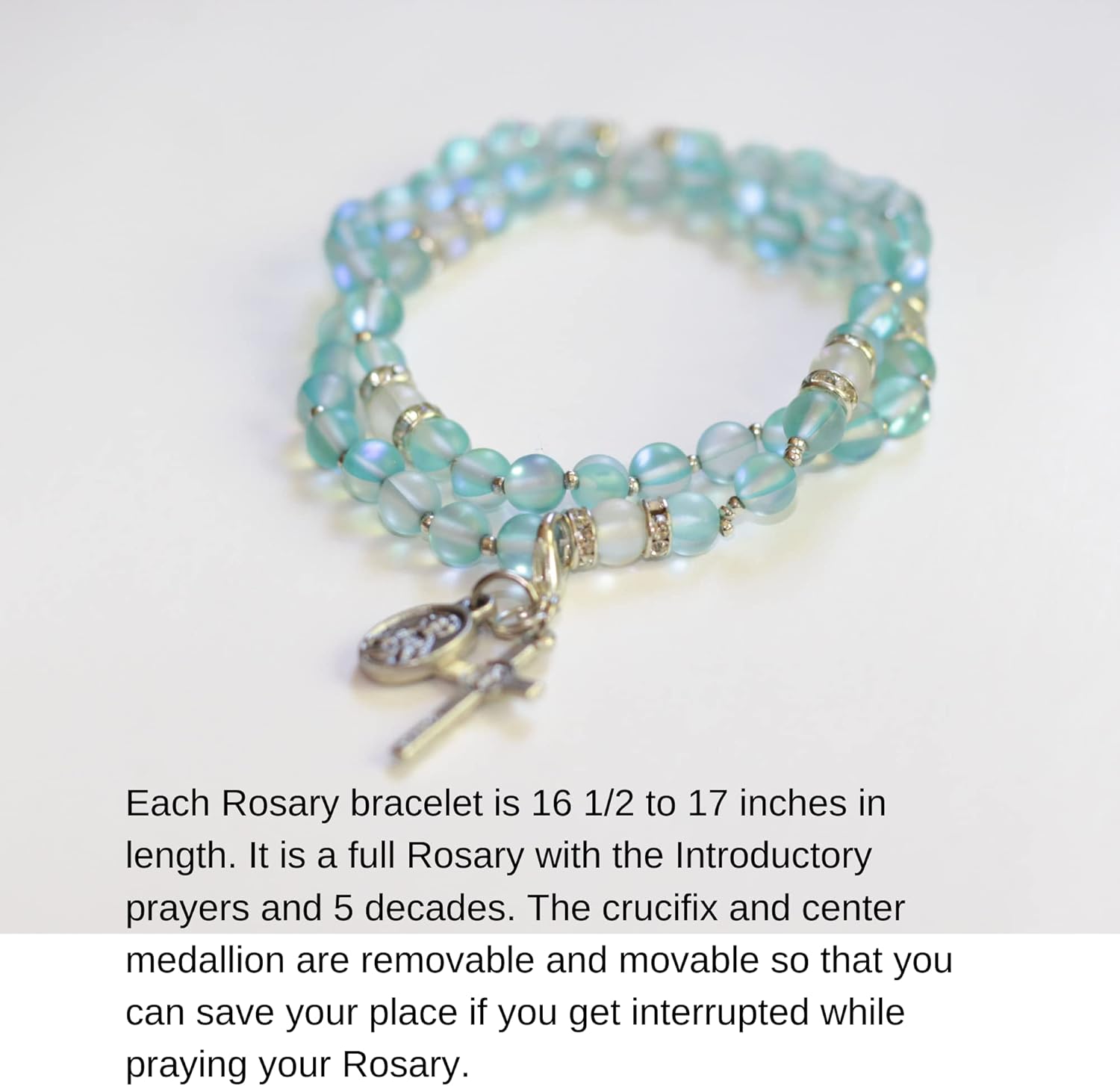 This is a full Rosary stretch bracelet that is handmade from aurora glass or "mermaid" beads that beautifully capture the light at different angles. Each bracelet is 16 1/2-17 inches in length and has a movable (lobster clasp) Crucifix and a customizable Hail Holy Queen medallion. Choose 1 of the 17 medallions listed below.