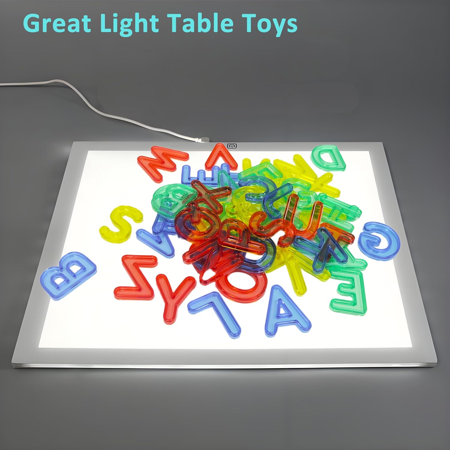 the Geometric Solids toys are perfect for little hands exploring geometry shapes 1.The geometric solids set includes 60 semi-transparent basic 3D shapes in 6 colors in 10 geometric configurations 2.The geometric shapes is made of high-quality materials, rounded and smooth, no burrs, lightweight, brightly colored 3.High-quality plastic geometric solids in a carrying bottle,storge and portable 4. This geometric shape develops children's color perception and identifies shapes,Perfect for developing hand-eye coordination and spatial reasoning 5.Sorting and stacking toys for Kids each block features a different pattern so shapes can be sorted by color, size or attribute. Creativity is encouraged as blocks are combined in various ways 6.Perfect Light Table Toys: Perfect for use with a light table or light box, the light is refracted through the translucent colorful 3D geometric blocks to create fascinating light effects. The perfect toy for kids to learn about geometric shapes. Bring the alphabet to life with these vibrant transparent capital letters, perfect for light table activities and early learning exploration. This comprehensive set includes 52 pieces featuring the complete alphabet in four eye-catching colors. Each letter is crafted from durable transparent material that illuminates beautifully when placed on a light table, making learning the ABCs an engaging sensory experience. Ideal for children ages 3 and up, these manipulatives help develop letter recognition, color sorting skills, and creative play. The letters come packaged in a sturdy storage container with a secure lid, making organization and cleanup hassle-free. Whether used in a classroom setting or at home, these translucent letters provide endless opportunities for educational activities, from spelling exercises to color mixing experiments. Note: Adult supervision recommended, as set contains small parts.