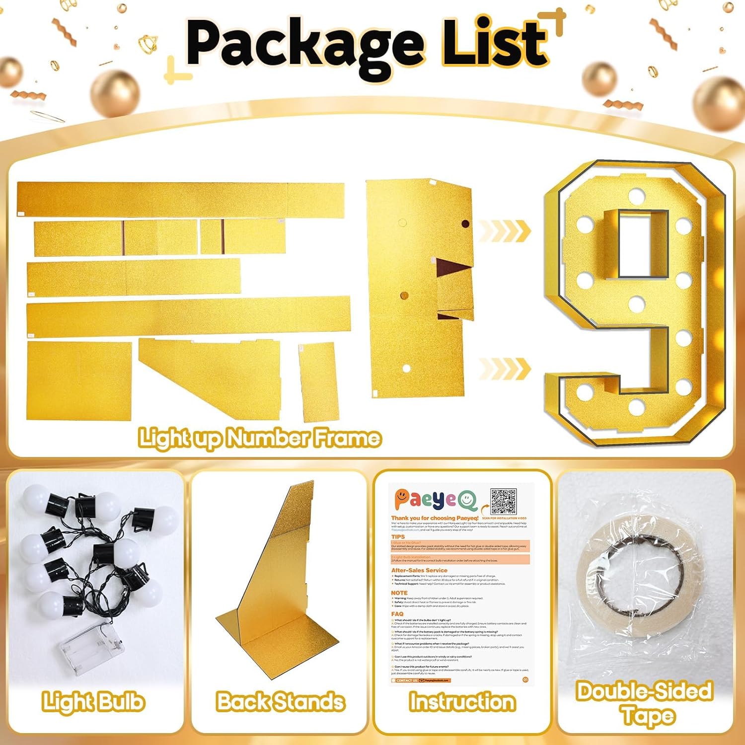 🎉 Elevate your celebrations with our versatile KT Board Number Sets! 🎉Specifications:💡 Material: High-quality durable foam board💡 Color: Elegant gold💡 Size: 4FT tallWhat You Get:🎁 1 x 4FT KT Board Number Set (Includes numbers 0-9 and double-digit combinations)🎁 1 x Easy-to-follow assembly instructions🎁 1 x Light Bulb🎁 1 x Double-Sided TapeFeatures:✨ Crafted from durable materials, this board is built to last through many celebrations.✨ Illuminate your space with warm LED lights, creating the perfect ambiance for any occasion.✨ Each number is crafted with meticulous attention to detail, featuring a luxurious black and gold color scheme.✨ The set includes individual numbers 0-9, allowing you to customize combinations for birthdays, anniversaries, graduations, and more.✨ Effortless assembly with included back stand ensures secure placement and stability.✨ Versatile design allows for multiple uses, making it perfect for parties, events, and celebrations of all kinds.Warm Reminder:⚠️ Please follow assembly instructions carefully for best results.