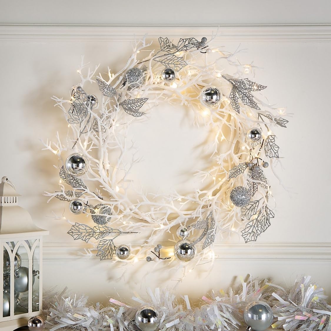 Add this light-up wreath to Christmas decoration displays. Material: Plastic. Size: 16" diam. Requires 3 "AA" batteries, not included.