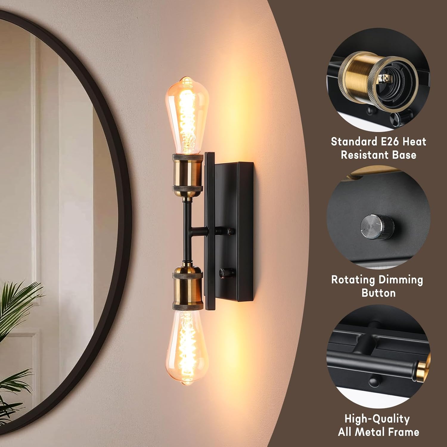 When it comes to wall and bathroom décors, lighting plays a crucial role. It can transform a small vanity room into a well-lit and inviting bathroom. The LIGHTESS 2-Light Black and Vintage Gold Vanity Light Fixture is the perfect choice, as it complements various styles ranging from starkly contemporary to retro aesthetics. It's perfect for various areas of your home, such as above a mirror or bed, at doorways, entryways, office or hotel hallways, or under a covered porch or patio. High Quality Metal Finish Featuring superior durable metal, our dimmable wall light fixtures have a black finish and a protective coating that resists tarnish and scratches. The high-quality metal pole prevents bending, ensuring a modern and polished appearance over time. Durable Bulb Holder The heat-resistant bulb socket enhances safety and reduces the need for frequent bulb replacements, making it a cost-effective and convenient choice for your home. Specifications: Color: Black and Vintage Gold Number of bulb sockets: 2 Material: Metal Installation Type: Wall-Mounted Package Include: 1 x Metal Lamp Base 1 x User Manual 1 x Tool Kit Note: bulbs not included.