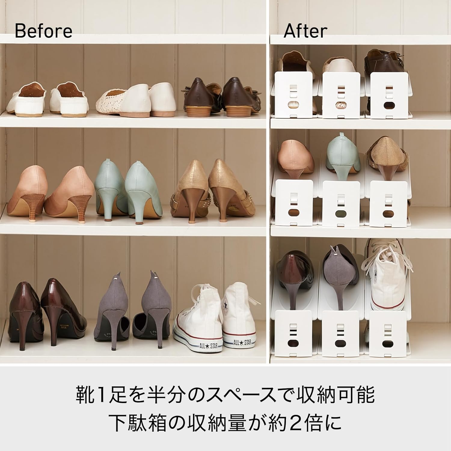 A set of variable shoe holders that evolve into shoe box storage. 3 adjustable levels to fit your shoe height Stores a variety of shoes in half the space and doubles the amount of storage than side by side