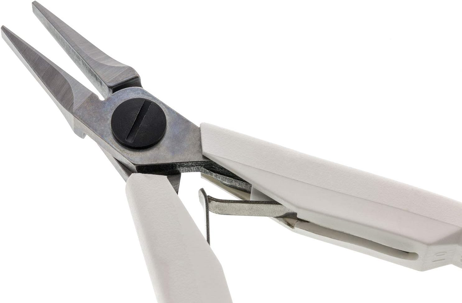 Lindstrom 7490 Supreme White Handle Flat Nose Plier - 1 pc. These Lindstrom Supreme flat-nose pliers deliver extremely precise jaw alignment—even at the tip—with very little joint wobble; the extra-long contact surfaces ensure a secure grip on your workpiece. On flat-nose pliers, both jaws are flat; the smooth interior surface helps reduce marring of delicate workpieces. Use flat-nose pliers for making wider, broader bends in wire, metal-forming, straightening and flattening out metal, making angled bends in metal and holding components. These pliers have a lap joint; one half of the joint overlaps the other, and a screw is set through both halves. The screw allows the joint to be adjusted as needed. The double-leaf spring consists of flat, tempered metal tabs attached to the inside of each of the tool handles, positioned to meet and hold the handles apart (and the jaws open) until they are squeezed closed, delivering a fast, strong rebound for improved productivity. The handles ergonomically designed for comfort and efficiency. All Lindstrom tool handles are latex free. Lindstrom Supreme pliers and cutters are precision-crafted in Switzerland from ball-bearing quality, high-carbon/high-chrome alloy steel that is hardened up to 65 HRC for the longest-lasting tools. The forging process offers the best combination of strength and durability; the jaws will not be nicked with normal use and will keep their shape and finish well over time. Jaw edges are smoothly radiused to protect workpieces; they meet perfectly along their entire length to ensure a secure and complete grip.