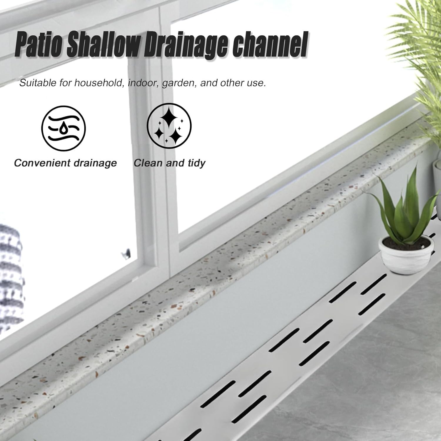 Our stainless steel drainage ditch solutions offer a versatile and efficient drainage system for various environments. Whether you are looking to enhance your garden, courtyard, or the side of your house, our products are ideal for shower rooms, terraces, office buildings, bathrooms, swimming pools, and sports fields.Key Features:- Durable Construction: Crafted from high-quality 304 stainless steel, our drainage systems are designed to resist rust and provide long-lasting performance.- Effective Drainage Design: The surface grille prevents larger debris from clogging the sewer, ensuring smooth water flow and reducing maintenance needs.- Easy Installation: Our drainage kits can be set up quickly without the need for special tools, making them perfect for DIY projects.- Customizable Size: The drain can be easily cut to fit any specific dimensions or shapes required for your space.- Optimal for Rainfall Management: These channels are specifically designed to manage water runoff efficiently, making them suitable for areas prone to heavy rainfall or standing water.- Compact and Practical: Ideal for low water flow areas, our channel drain kits are perfect for both indoor and outdoor applications.- Hygienic and Easy to Clean: The detachable design allows for straightforward cleaning; simply rinse with water to remove hair and dirt.Specifications:- Material: 304 Stainless Steel- Color: SilverPackage Includes:- 1 Drain KitWe are committed to providing excellent customer service. If you have any inquiries regarding our products, please feel free to reach out to our 24-hour customer support team.