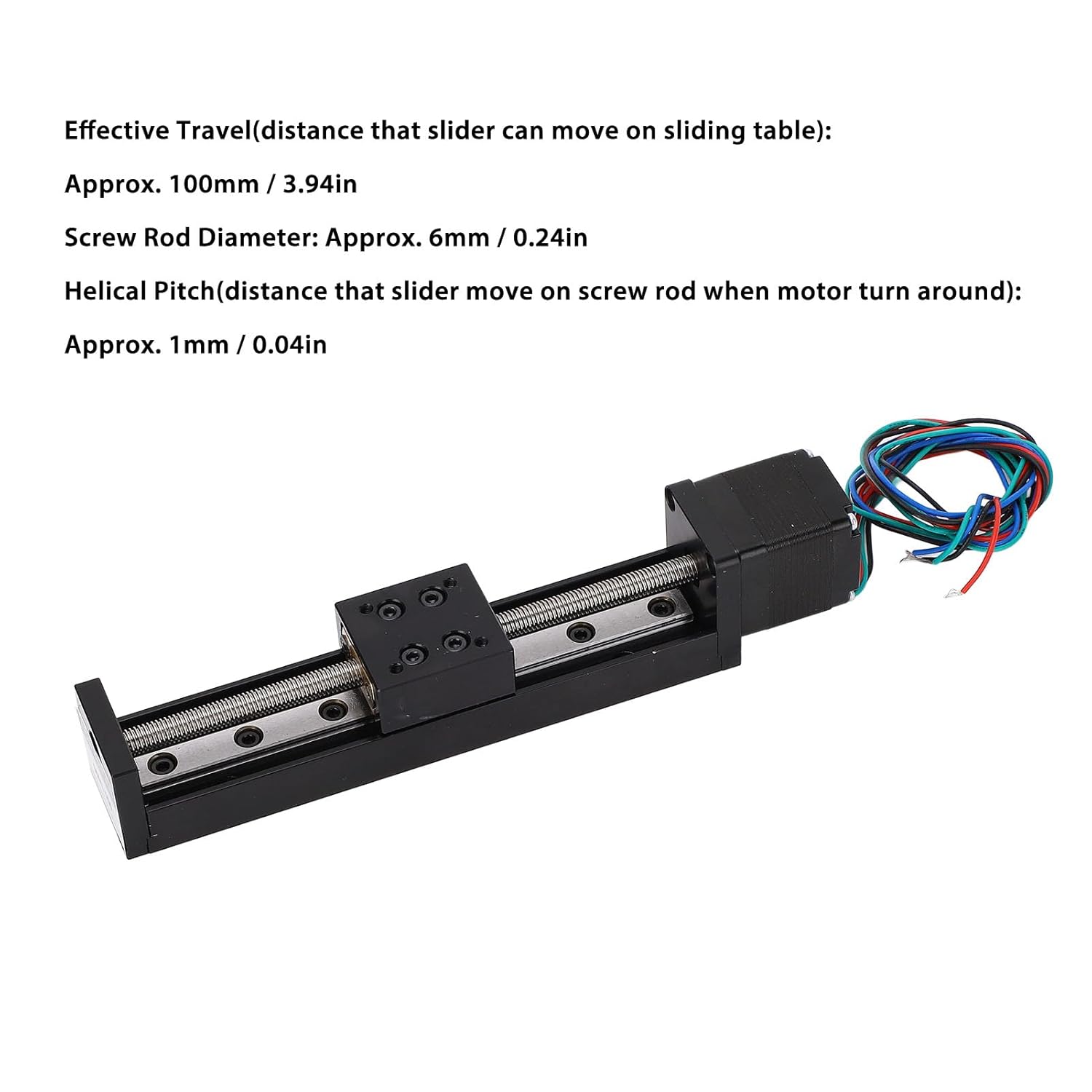 Specification: Item Type: Mini Linear Rail Guide Slide Actuator Material: Aluminium alloy Effective Travel(distance that slider can move on sliding table): Approx. 100mm / 3.94in Screw Rod Diameter: Approx. 6mm / 0.24in Helical Pitch(distance that slider move on screw rod when motor turn around): Approx. 1mm / 0.04in Screw Rod Accuracy: ±0.01mm Load: Horizontal: ≤5KG; Vertical: ≤1KG Positioning Accuracy: ±0.1mm Holding Torsion: 6N.cm Current: 0.6A : 5.5Ω Inductance: 3.2MH Speed: 0-120mm/s Step Angle: 1.8 Degrees How to Use: Install and use directly. Package List: 1 x Mini Linear Rail Guide Slide Actuator