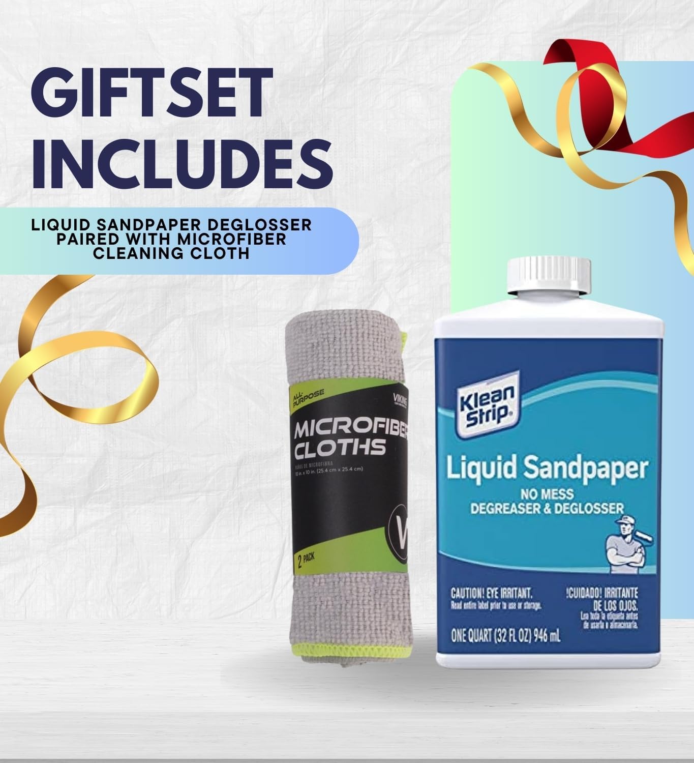 This liquid sandpaper deglosser offers a straightforward way to prepare coated surfaces for new finishes. It is designed for users who want to update cabinets, trim, doors, or furniture without the effort of sanding. By helping surfaces accept new coatings, it supports refinishing projects where consistent adhesion is important. Its liquid form makes it suitable for flat areas as well as detailed sections where traditional sanding may be difficult. The formula is water-based, allowing it to spread evenly across painted or varnished surfaces. When applied with a cloth or applicator, it softens the existing sheen so the next layer of coating can bond more effectively. This makes it useful for updating kitchen cabinetry, wood moldings, or decorative trim where maintaining surface shape is important. The liquid composition reaches corners and grooves while remaining manageable during application. Users can rely on the deglosser for tasks involving paint, varnish, enamel, or stain, giving it flexibility across different coating types. It assists in surface preparation without producing dust, which can be helpful in indoor projects. After application, the surface can be wiped down and readied for its next coating step, supporting a smooth workflow during refinishing. This gift set includes 1x Liquid Sandpaper Water-Based Sander Deglosser 1 qt and 1x Microfiber Cleaning Cloth as a supporting accessory for wiping, residue removal, and preparation between steps. The deglosser arrives in a quart container for easy handling, while the cloth is sized for general-purpose cleaning and surface care. Together, this two-item set provides a simple, organized approach to preparing coated surfaces for updated finishes.