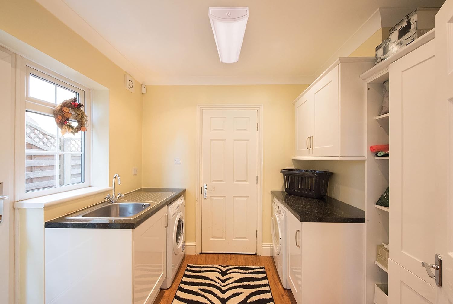 Worry Free Renovation: The Lithonia Lighting Low Profile Wide Housing LED Wraparound Ceiling Light was designed with the renovator in mind. While compatible with new construction, it’s no mystery its flexibility will keep renovation simple. A wider housing easily covers up existing blemishes from older fixtures. It is engineered for versatility, durability, and sleek modern style. Whether you're upgrading your garage lights, adding task-ready brightness to a utility room, or simplifying a renovation, this 4-foot LED ceiling light delivers reliable, energy-efficient illumination. 5000 lumens of 4000K cool white light and and 0-10V dimming allows for smooth, modern lighting control integration in commercial or residential environments. The frosted polycarbonate diffuser ensures even lighting, while the metal housing hides imperfections left by old fixtures. Rated for damp locations and backed by a 5-year warranty, it's the perfect match for closets, workshops, hallways, and beyond.