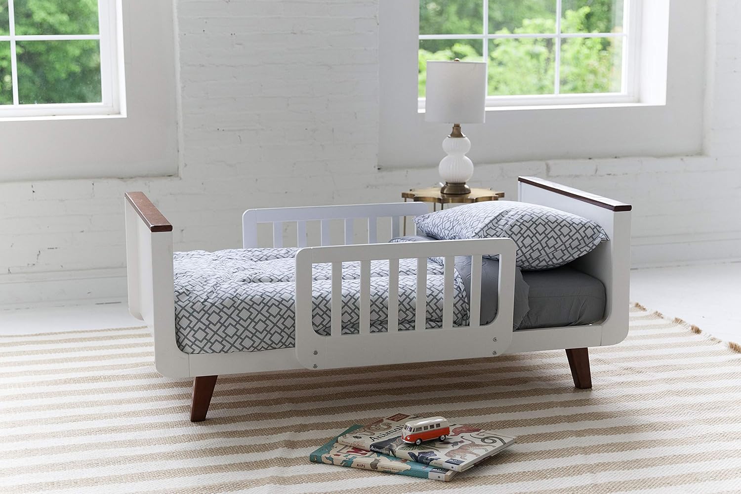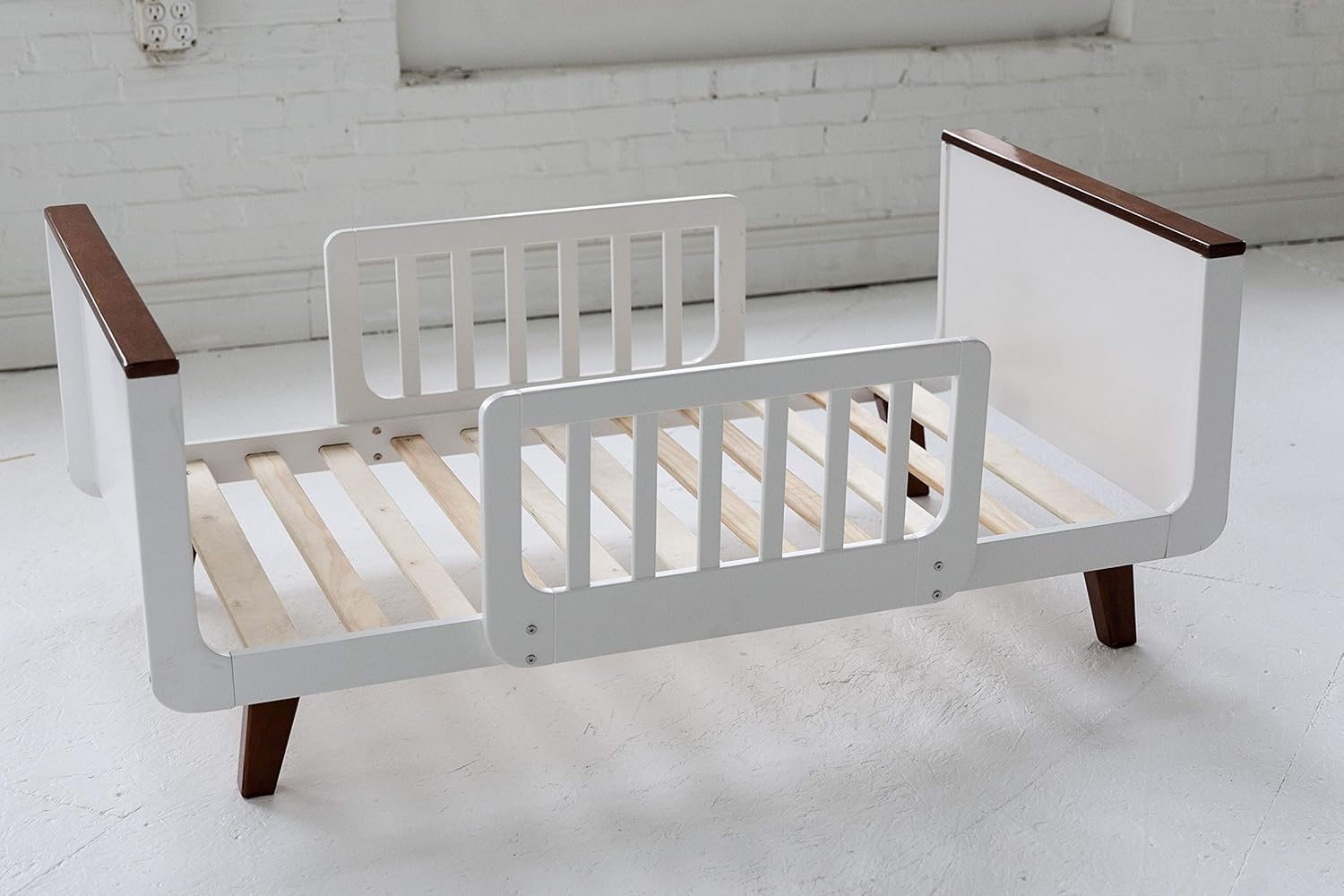 Our MOD Toddler Bed is a contemporary solution to help with the transition from baby crib to kid's bed. The sleek bed frame for children encourages growing independence in a safe and comfortable bed. This modern kid's bed features solid wood construction for lasting durability and is designed with safety in mind. With a low-to-ground design for easy access, our child's transitional bed also includes two center-mount guard rails that help provide a secure sleep environment for your little one. In addition to meeting all government safety standards, our products have gone through ASTM testing. We go the extra step with Greenguard Gold Certification, contributing to cleaner indoor air and a healthier environment for you and your family. Please note that assembly is required using the included tools and hardware. Mattress is not included. Bed frame for children can be used beginning at 15 months and holds up to 50 lbs. The MOD Toddler Bed is constructed from the highest-quality birch LVL wood, finished in child-safe materials, and can easily be cleaned with soap and water. Assembled dimensions: 56.69” (L) x 28.82” (W) x 22.17“ (H).