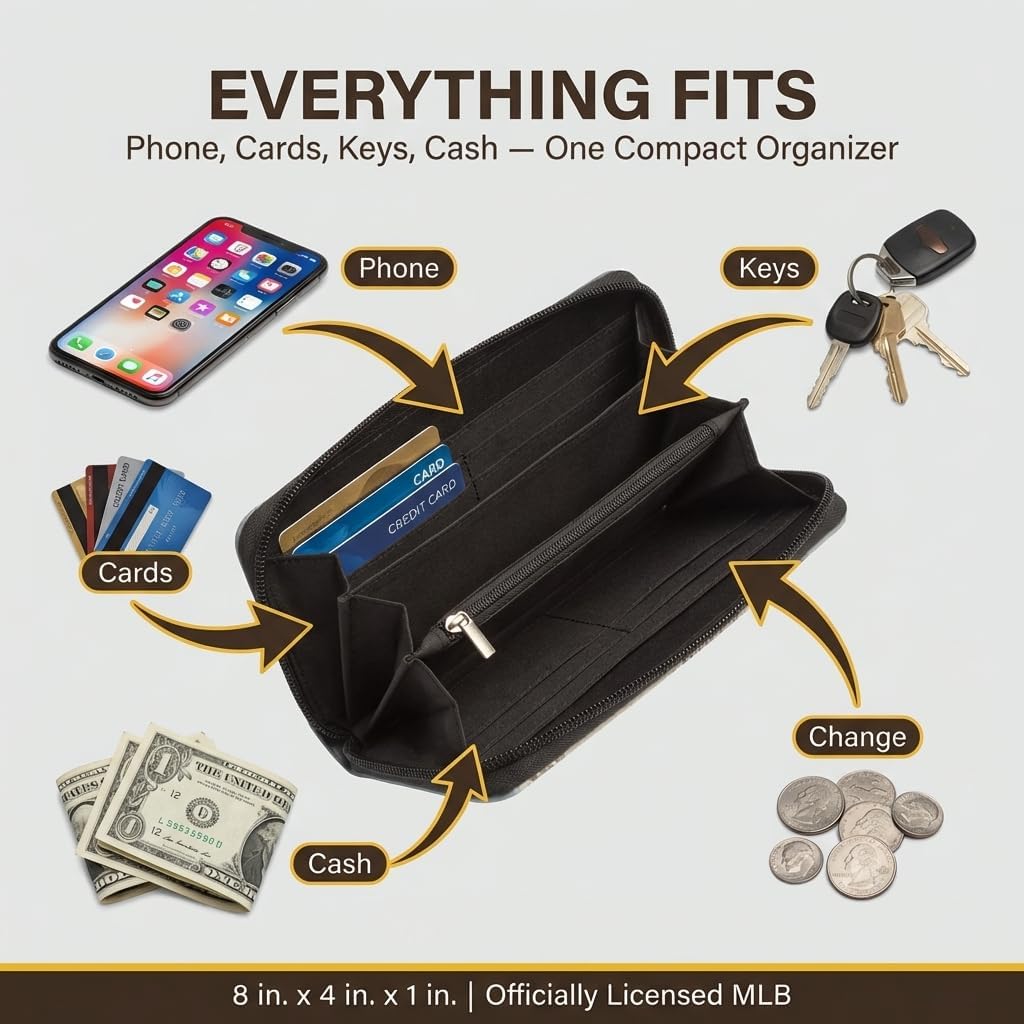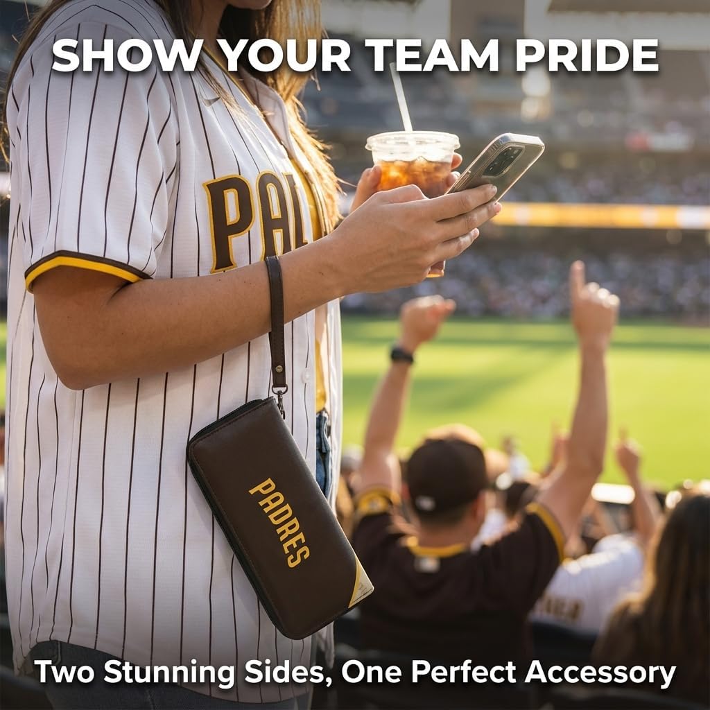 San Diego Padres Curve Zip Organizer — The Only Wallet You Need on Game DayDesigned for the fan who wants to travel light without leaving anything behind. The Littlearth Curve Zip Organizer holds your phone, cards, cash, keys, and change in one compact 8 x 4 x 1 inch organizer that fits in your hand or clips to your wrist.Eight card slots, two full-length cash pockets, and a zippered center compartment keep everything sorted. The accordion-style zipper opens wide so you can find what you need without digging. Detach the 5.75-inch wristlet strap when you want to tuck it into a bag instead.The polyurethane outer features two distinct designs — the Padres swinging friar logo on front and the cursive San Diego Padres script on back. Scuff-resistant and easy to clean; just wipe with a damp cloth.Officially licensed MLB product by Little Earth Productions. Imported.