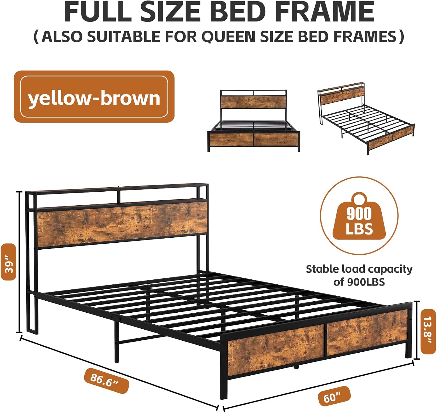 Industrial Full Size Bed Frame with LED Lights and 2 USB Ports, Metal Platform Bed Frame Full with Storage Headboard, Solid and Stable, Noise Free, No Box Spring Needed, Easy Assembly