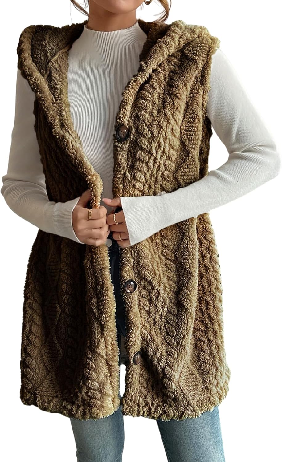 Stay warm and stylish this season with the LIZALIG Button Down Sherpa Hooded Solid Outerwear Vest Jacket. Designed for women who appreciate both comfort and fashion, this thick and cozy sleeveless fleece vest is perfect for layering over your favorite outfits. Crafted from high-quality sherpa material, this jacket offers exceptional warmth while maintaining a lightweight feel. The single-breasted design adds a touch of sophistication, while the button-down front allows for easy wear and versatility. With spacious pockets, you can keep your essentials close at hand without sacrificing style. Ideal for casual outings, outdoor adventures, or simply lounging at home, the LIZALIG vest serves as a versatile piece in your wardrobe. Its solid color ensures it pairs beautifully with a variety of tops, making it an essential addition to any fashion-conscious woman’s closet. Embrace the cold weather with confidence and flair—choose the LIZALIG Button Down Thick Warm Women's Solid Fleece Hooded Casual Sherpa Vest Jacket with Pockets for your next outerwear staple!