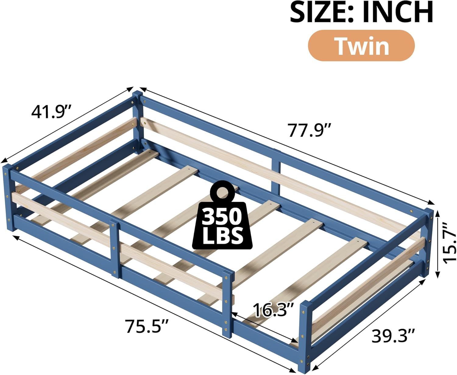 Product SpecificationThis solid pine Montessori floor bed sits just 15.7" off the ground, letting kids climb in and out safely while building confidence. Four full-height, toy-catching rails create a secure, pinch-free nook that doubles as a play fort—no box spring needed. Tool-free assembly means bedtime independence starts today.Product InformationMain Color:Natural,Blue Gray,CoffeeMain Material:WoodBed Size:TwinProduct DimensionsAssembled Length (in.):77.9Assembled Width (in.):41.9Assembled Height (in.):15.7Kind RemindManual measurement has been used, there may be some reasonable error.Product pictures are for reference only. Real product's color may be a little different from the image due to the lighting or monitor's display.If there is any damage, missing parts, defect with the item you received, just don't worry. You can reach us for support.Due to the large size of the product and inconvenient transportation, once the order has been shipped, we only accept the return requests due to quality issues. Hope you can understand.