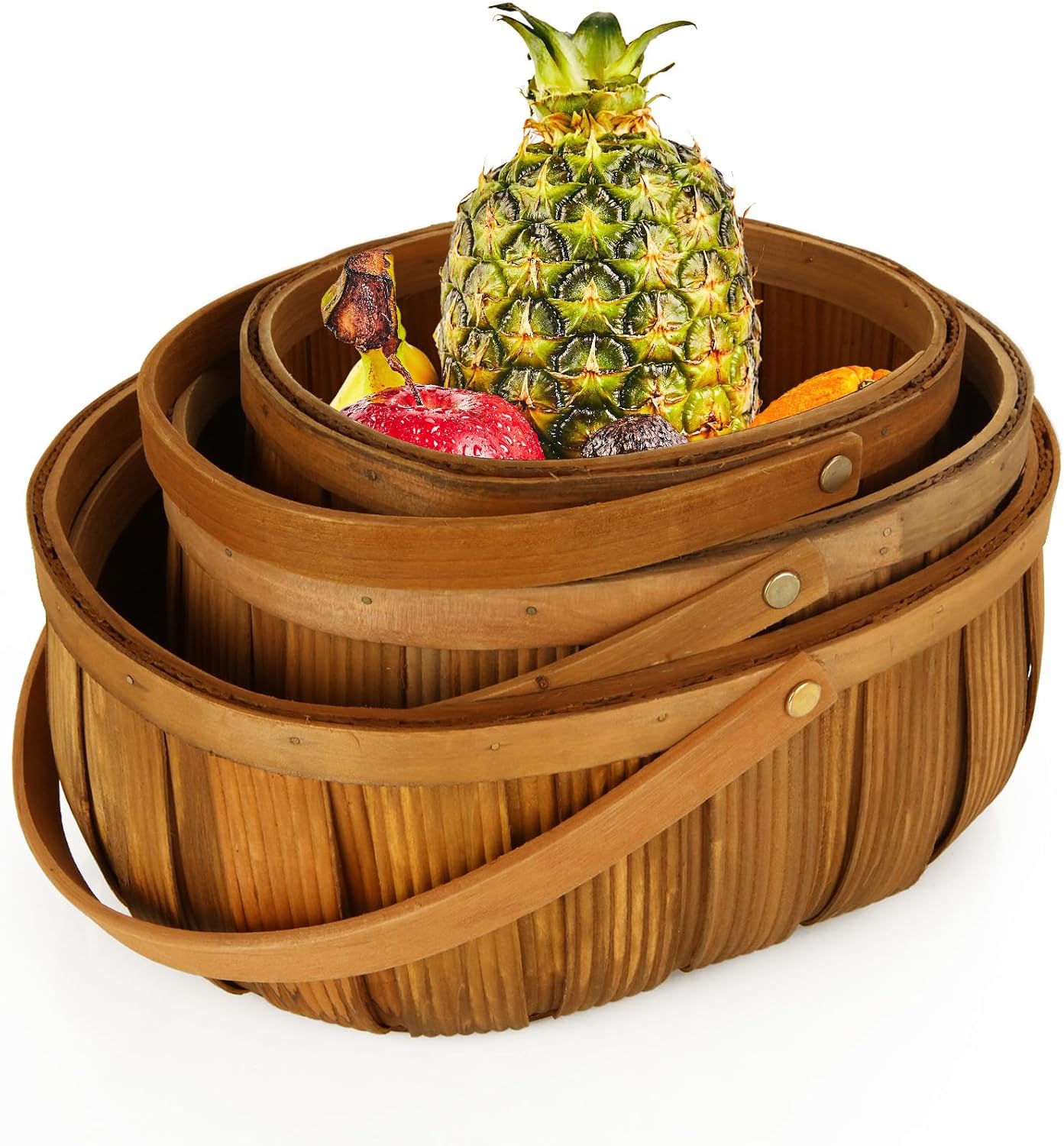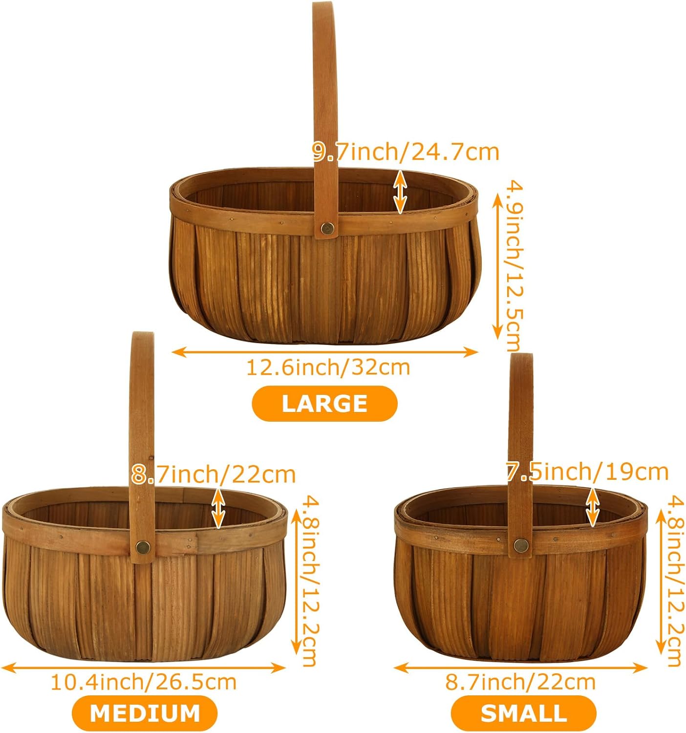3 Size wicker bread baskets, wood chip picnic basket with handles for fruits vegetable storage; picnic, gift packing, wedding use. Features High-quality wicker baskets made from durable natural woodchip material, designed to withstand the test of time for long-term use. The comfortable wooden handle is strong and smooth. Easy and secure carrying, enhancing the vintage picnic basket experience. Multipurpose design suitable for fine dining, outdoor picnics, and everyday use. Ideal for breads, candies, crackers, finger foods, fruits, vegetables, food serving, display, and snacks. Adds a touch of classic and vintage style to kitchen counters and home decorations, enhancing organization and tidiness. Specification: Size: (L) 12.5" L x 9.7" W x 4.8" H, (M) 10.2" L x 7.9" W x 4.3" H, (S) 8.5" L x 6.4" W x 4" H Material: Natural wood-chip Package include: 3 x Wicker picnic basketWarning: Wood chips may be produced when processing wood products. Avoid inhaling wood dust or use a dust mask or other safeguards for personal protection.