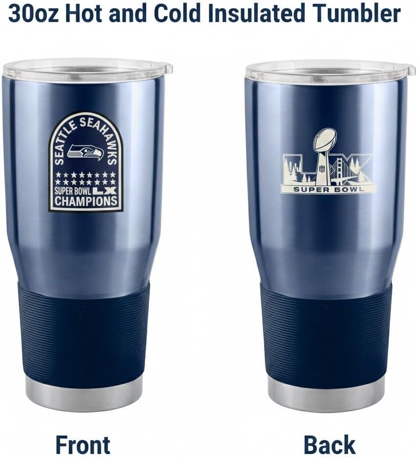Ice Cold Victory. All Day Long. ICE COLD VICTORY. ALL DAY LONG. The Seattle Seahawks are World Champions! Commemorate that legendary Super Bowl LX victory with a tumbler that performs as well as the defense did in Santa Clara. The Logo Brands Seattle Champions 30oz Stainless Steel Tumbler is the gold standard for fan hydration, marking the beginning of the Mike Macdonald championship era. ADVANCED TEMPERATURE CONTROL Forget lukewarm drinks. Built with professional-grade double-walled vacuum insulation, this travel cup locks in temperature for the long haul. It keeps your water ice-cold for over 24 hours or your morning coffee piping hot throughout the entire workday. BUILT FOR THE 12TH MAN:Premium 18/8 Stainless Steel: Puncture-resistant, rust-free, and built to survive everything from the daily commute to the victory parade.No-Sweat Design: The vacuum-sealed exterior stays completely dry, keeping your hands and cup holders safe from condensation.Travel Ready: Features an ergonomic comfort-grip handle and a tapered base designed to fit into most standard vehicle cup holders.Eco-Friendly & Safe: 100% BPA-free and reusable, replacing thousands of single-use plastic bottles with a lifetime piece of Seahawks history. TECHNICAL SPECIFICATIONS: Capacity: 30 Fluid Ounces Material: Food-Grade 18/8 Stainless Steel Inclusions: Splash-resistant lid and reusable straw Performance: Cold 24h+ / Hot 8h+ Raise your cup to the best fans in the NFL. Grab your official Super Bowl 60 tumbler today! GO HAWKS!