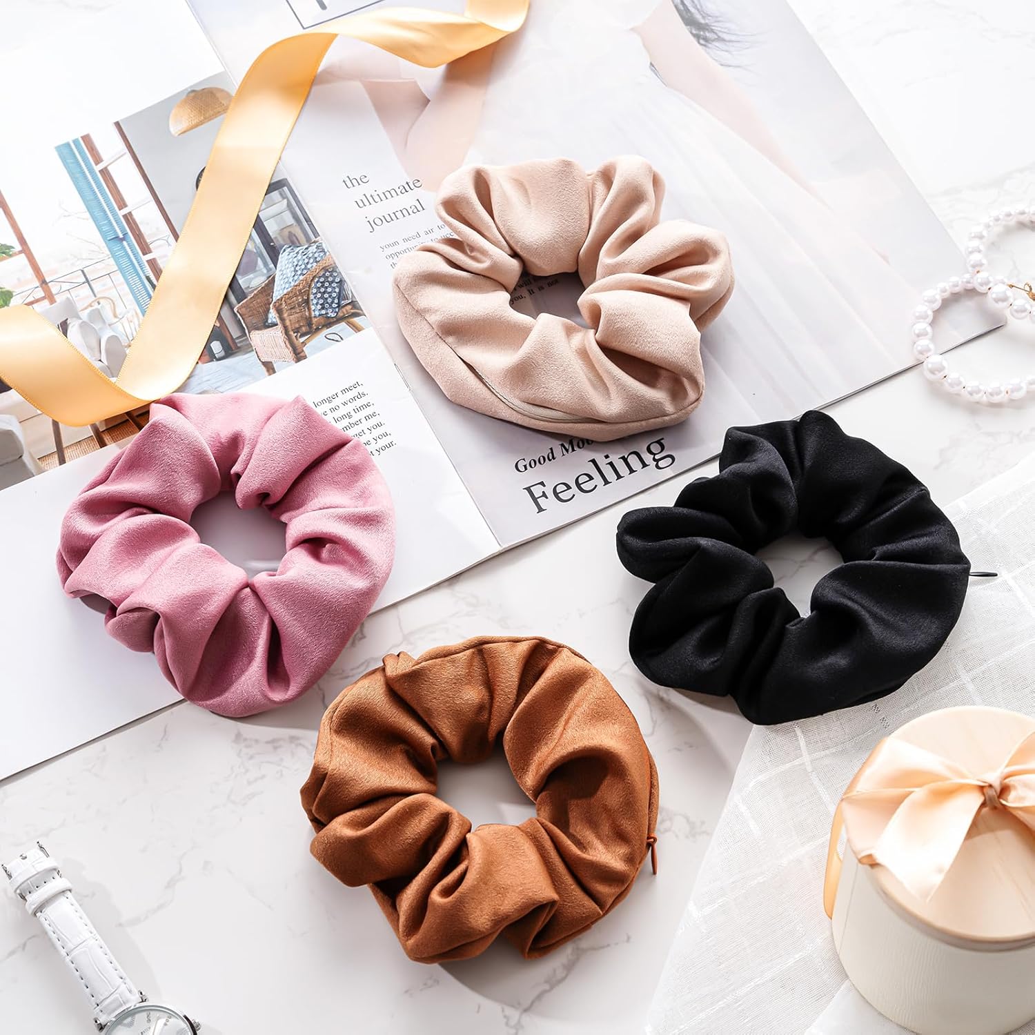 This pack contains a Hanging Jewelry Organizer and a set of 4 Hair Scrunchies With Zipper Pocket