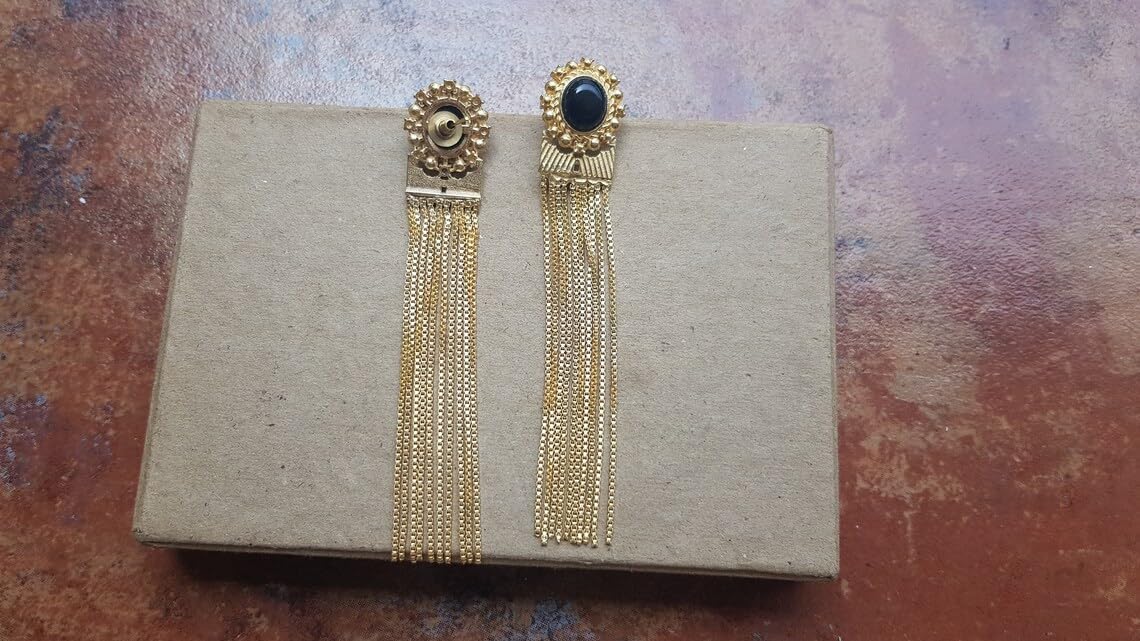 Introducing our exquisite Natural Black Onyx Long Statement Dangle Earrings with Chain Tassels - a masterpiece of natural gemstone elegance and Bohemian charm. Elevate your style with these stunning earrings that effortlessly combine the timeless allure of black onyx with the luxury of gold-plated brass tassels. ๐ Key Features: โจ Natural Black Onyx Gemstones: These earrings showcase the beauty of genuine black onyx, known for its protective and grounding properties. The deep black hue exudes sophistication and strength. โจ Long 22k Gold Plated Brass Tassels: The 22k gold plating on the brass tassels adds a touch of opulence to these statement earrings. The elongated tassels create a graceful, flowing movement that catches the eye. โจ Statement-Making Design: These earrings are designed to make a bold statement while maintaining an air of refined elegance. They effortlessly transition from casual to formal occasions. โจ Handcrafted with Care: Each pair is meticulously handcrafted, ensuring the highest quality and attention to detail. Our artisans have poured their passion into creating these unique pieces. โจ Lightweight and Comfortable: Despite their striking appearance, these earrings are lightweight and comfortable for extended wear. You can flaunt your style with ease. ๐ผ Product Details: Materials: Natural black onyx gemstones and 22k gold plated brass. Length: Approximately [4 Inch]. Hypoallergenic Hooks: Safe and comfortable for sensitive ears. ๐ฟ Embrace the timeless beauty of black onyx and the free-spirited essence of Bohemian jewelry with our Stylish Black Onyx with Long 22k Gold Plated Brass Tassels Dangle Earrings. Make a statement that reflects your unique taste and inner strength. ๐ Click "Add to Cart" now to add these exquisite earrings to your collection. Elevate your style with the perfect blend of natural gemstone and Bohemian luxury, and capture the essence of elegance and grace.