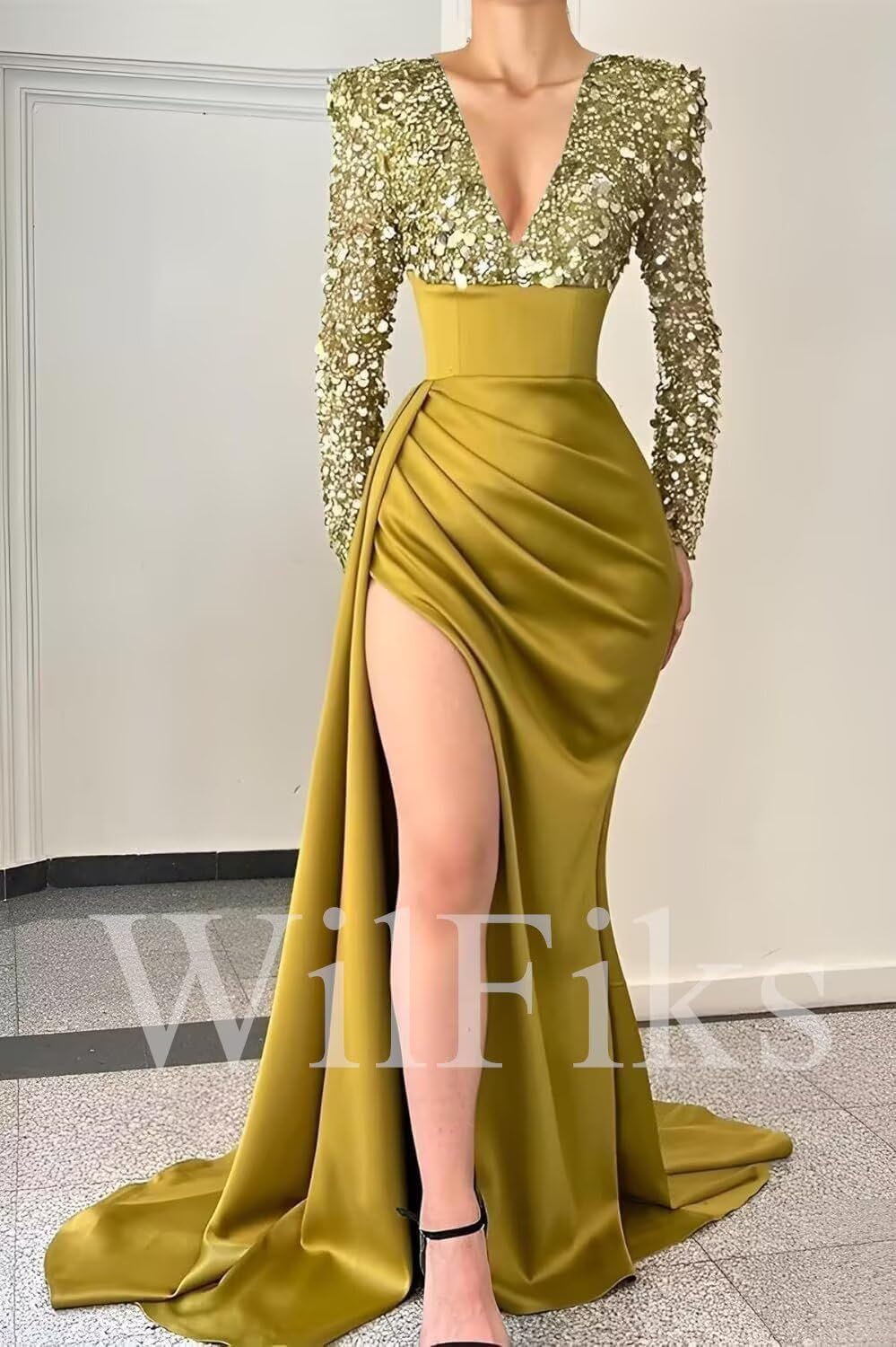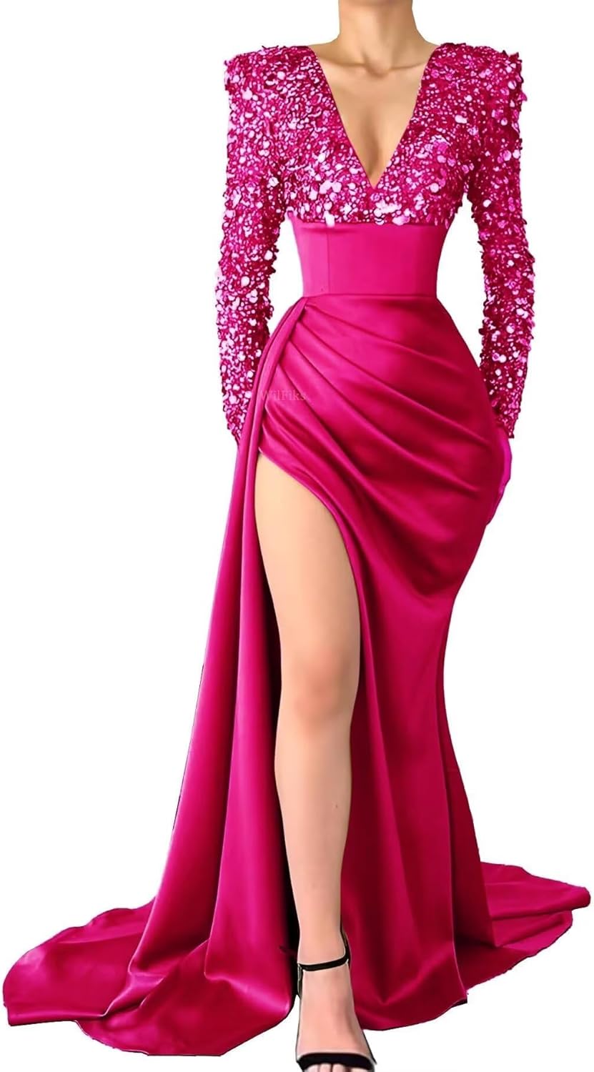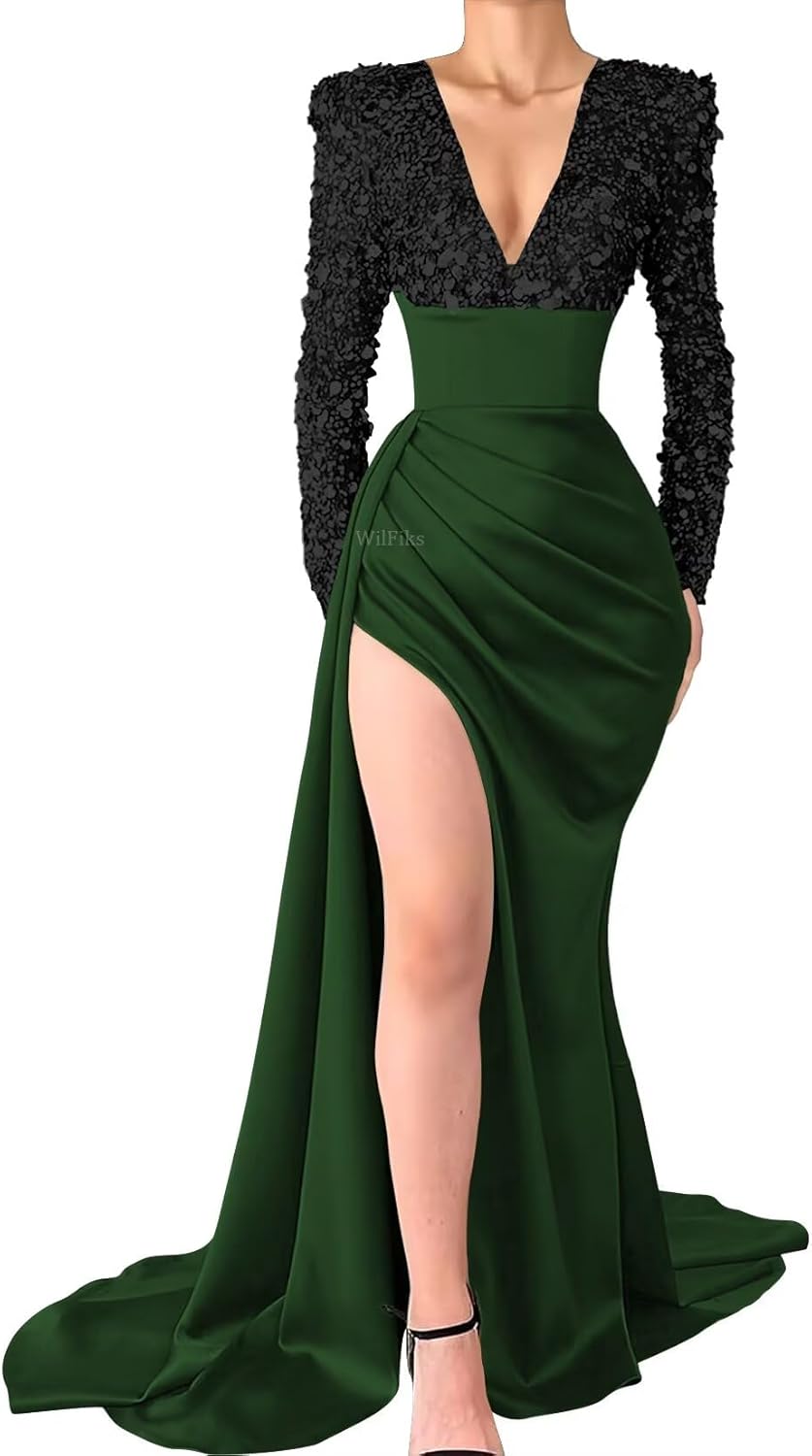 Welcome to WilFiks store !We are a professional women's clothing store, specializing in various formal and semi formal women's dresses such as wedding dresses, prom dresses, homecoming dresses, bridesmaid dresses, mother of the bride dresses, ball gown, evening dresses, etc.If you are looking for a long sleeve formal dress in your important event, you can take a look at this deep v neck sequin mermaid prom dress long sleeve satin formal gala dresses for women elegant sparkly evening ball gown with slit.If you need to customize this sparkly dress, please provide the following size measurement:1.Bust _____Inch/cm2.Waist _____Inch/cm3.Hips _____Inch/cm4.Hollow to Floor(without shoes) _____Inch/cm5.Height(without shoes) _____Inch/cm6.Heels _____Inch/cm7.Your life style photoshoot dresses NOTES:1.The real color of the item may be slightly different from the pictures shown on website caused by many factors such as brightness of your monitor and light brightness.2.Please allow slight deviation for the measurement data.