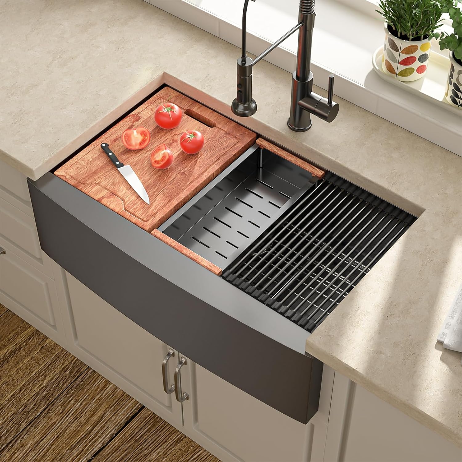 | Included Components | 33 inch stainless steel farmhouse sink, basket strainer drain, cutout template, cutting board, colander, mounting clips and installation instruction, roll-up rack, bottom rinse grids |