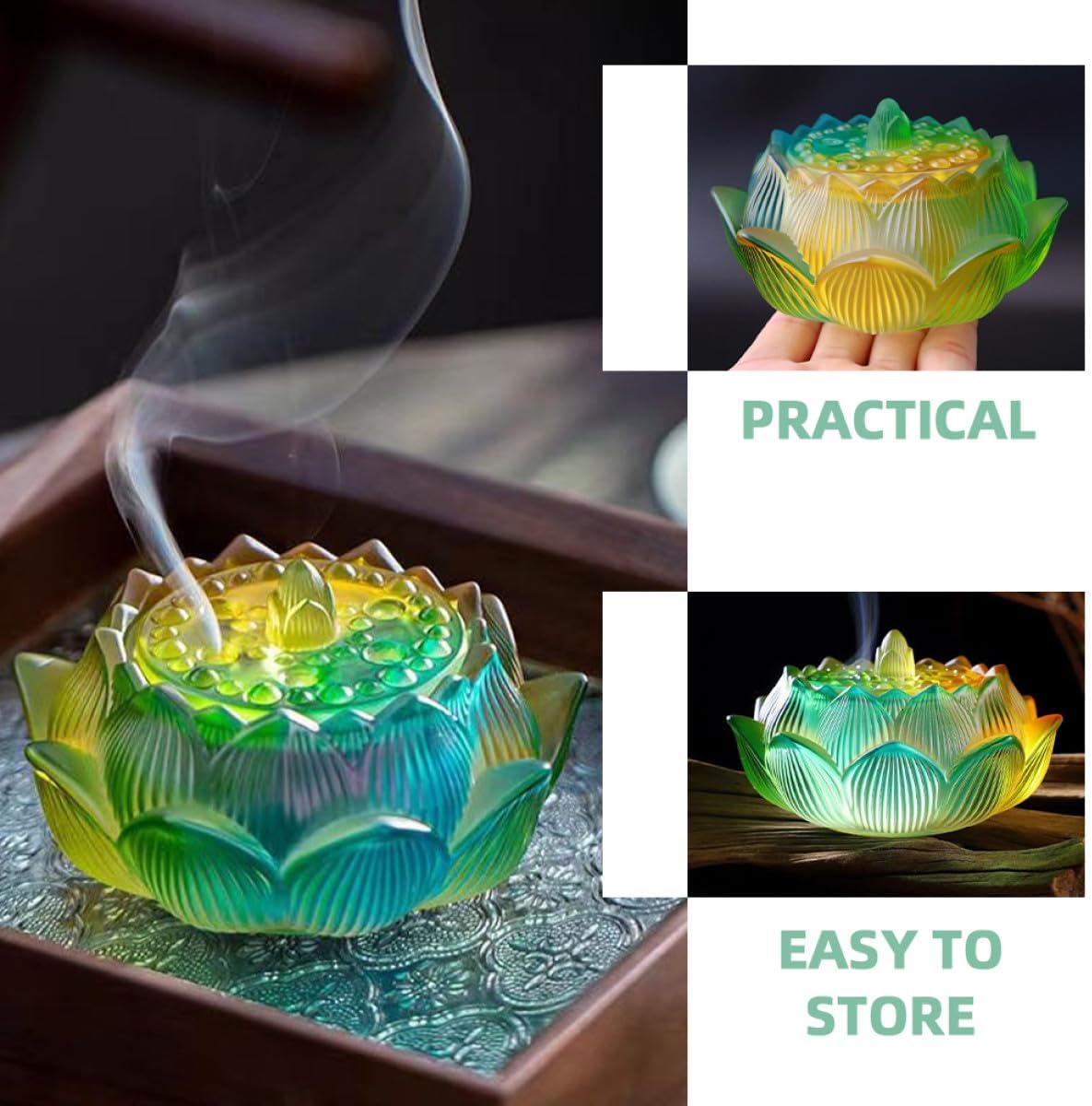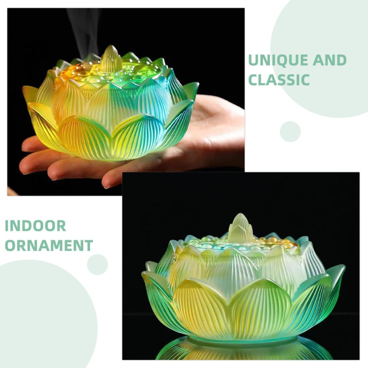 Package Include 1 x incense burner Characteristics -Size:11.50X11.50X6.70cm/4.52X4.52X2.63in -Color:Multi -Material:Glass -Product Info:Lotus incense burner - Adoption of glass materials, this delicate incense burner will serve you for a lasting time. - Excellent workmanship and elegant appearance ensure incense burner popularity and practicality home decor. - Close the lid, it smoke, brings you aroma, fills your whole room, and enjoys your life home decoration. - Made of glass, beautiful and strong. The lotus censer is perfect for collecting all the ash and keeping the room decor. - The incense burner can be decorated. Also with ease to create a relaxed, calm and happy atmosphere scent sticks holder.Goods Descriptionscent sticks holder This is an incense burner, made of glass materials, sturdy and practical.asian decor The incense burner is suitable for many scenes, such as bedroom, living room, dining room, study, office, etc.home decor It's made with excellent workmanship, looking and awesome