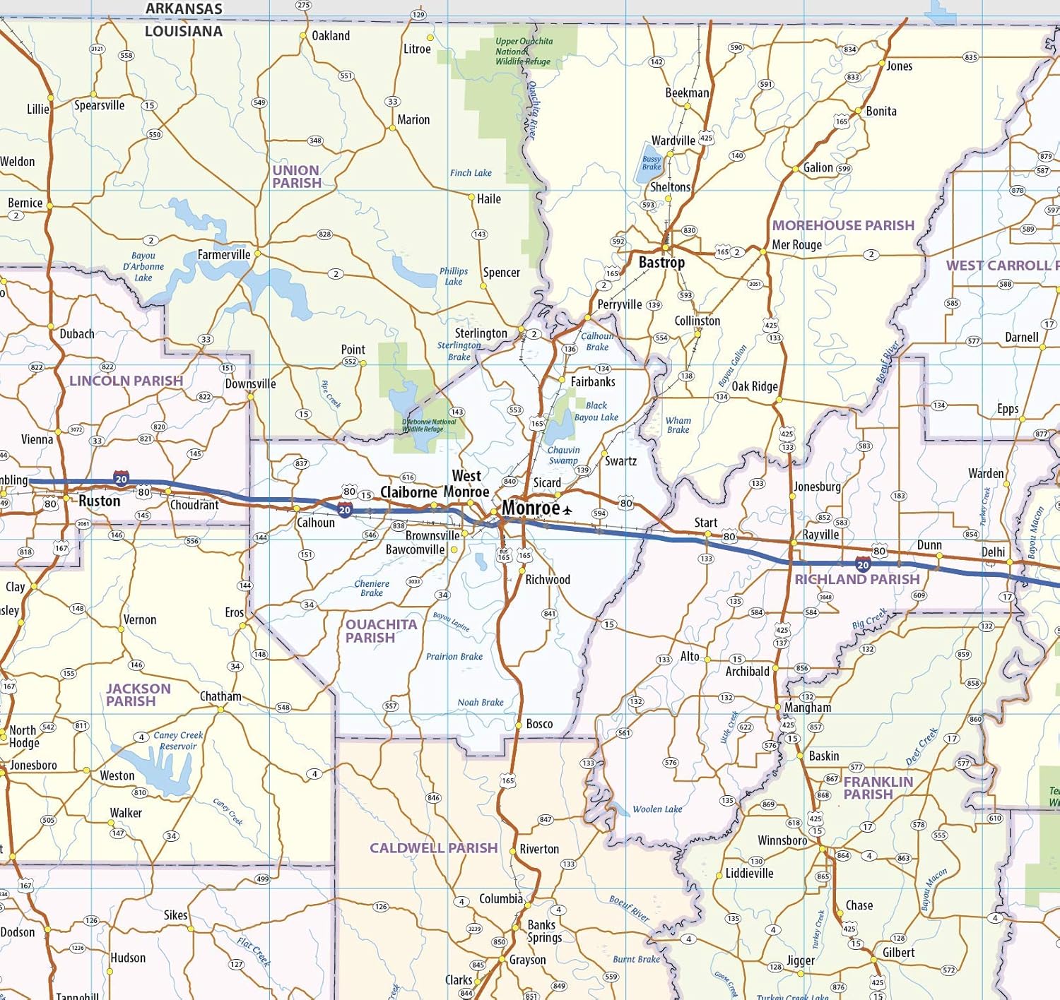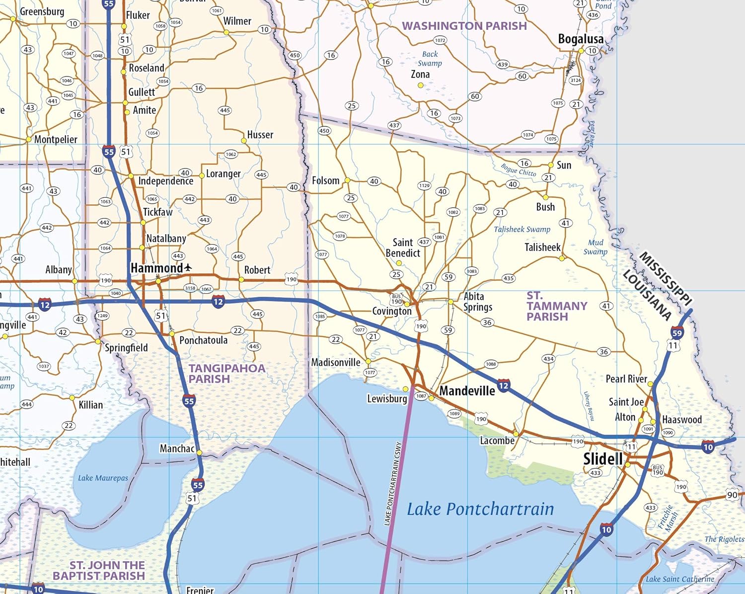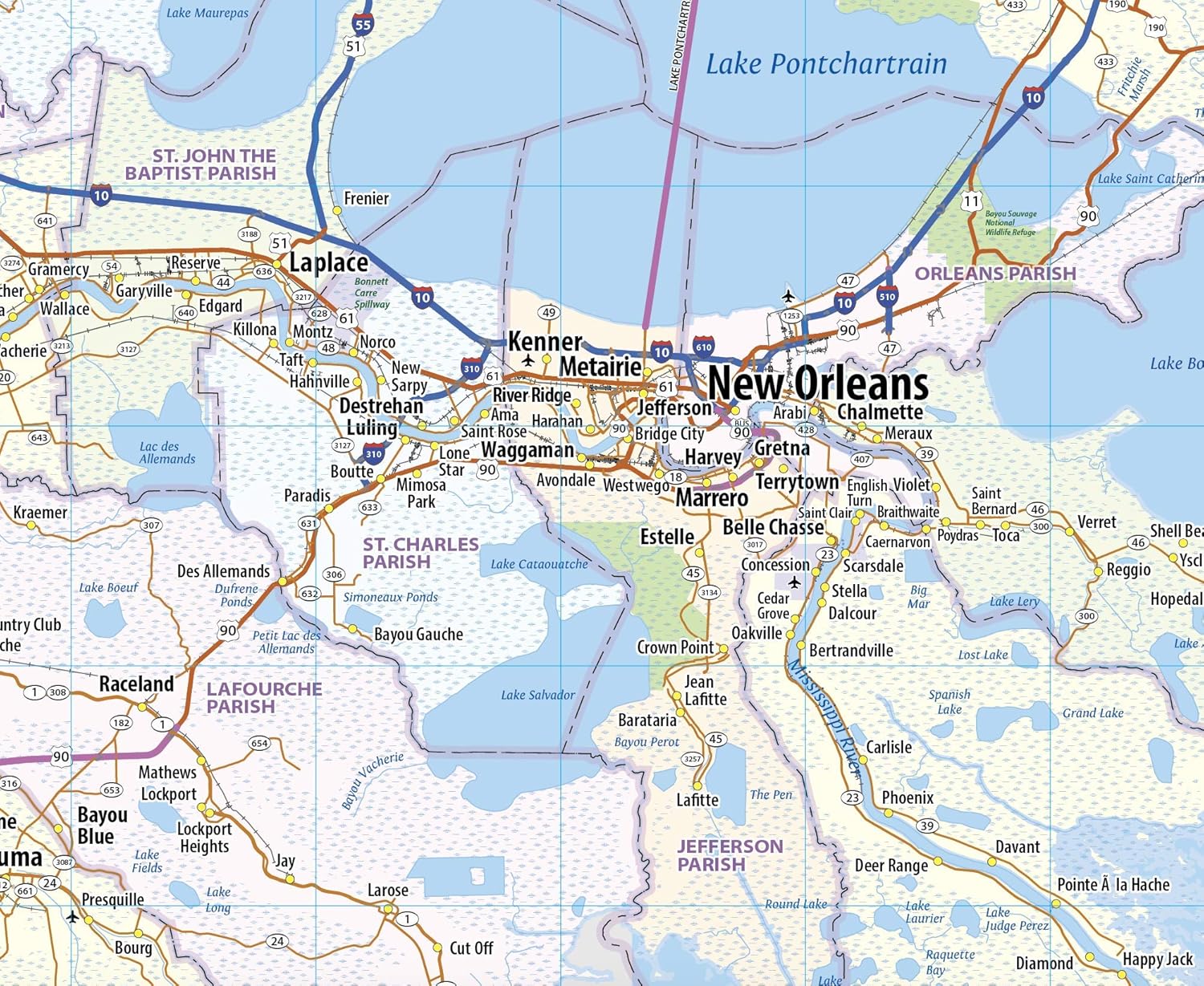 Laminated wall map of Louisiana, showing parishes, towns, cities, hamlets, major roads and highways. Includes community index. Laminated map comes rolled in a sturdy tube.