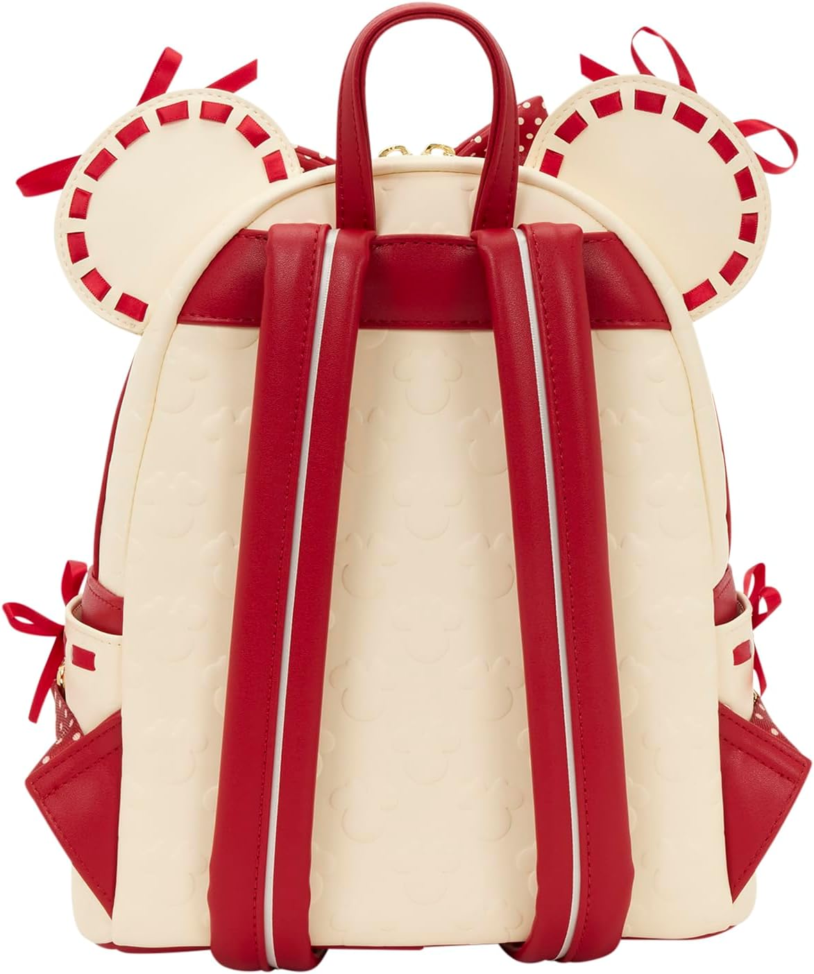 Who's ready to rock the dots again with Disney’s Minnie Mouse?! This mini backpack is cream and red. You'll find embossed polka dots on the front pocket. Over the rest of the bag, you'll find Minnie Mouse silhouettes. Satin ribbons add extra cuteness to the side pockets and 3D applique ears. There's also a red bow with white polka dots between the ears! You'll also find satin details on the straps. It's a super cute accessory to add some Minnie Mouse magic to your day!