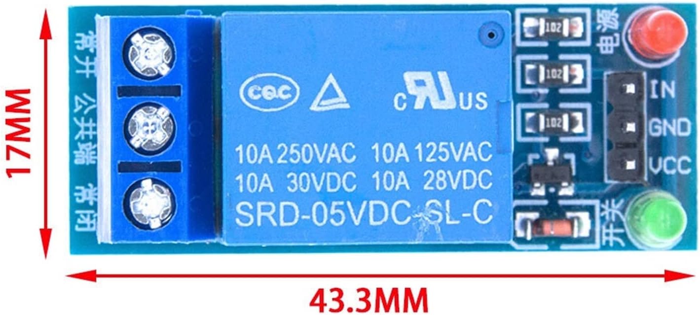 relayVoltage version:-----5V-------------12V-------------24VQuiescent Current: 4mA-----------5.5mA----------12mAWorking current:---65mA-----------42mA----------40mATrigger voltage:-----0-2V------------0-4V-----------0-12VTrigger current:-----2mA------------3mA-----------3mARelay contact capacity: 250V 10A (AC) or 30V 30A (DC)The relay module with optical coupler is 5V 1248 channel. Relay output 1248 channel relay module for Product Description:One way relay moduleMaximum load: AC 250V / 10A, DC 30V / 10ATrigger current: 5mAWorking voltage: 5VModule size: 50x26x18.5mm (L x W x H)Four mounting bolt holes with a diameter of 3.1 mmDC +: positive power supply (VCC)CC -: negative power supply (GND)Input:low level control relayNo: normally open relay interfaceCOM: universal interface relayNC: normally closed relay interfaceRelay module channel 21 Size: 50.5mm (L) * 38.5mm (W) * 18.5in (H)2 weight. 31 G3. PCB color: BlackThe four panels have four screw holes in four weeks. The hole diameter is 3.1 mm, which is easy to install and fix5 SPDT high quality batch music relays. 1 common terminal, 1 normally open terminal and 1 normally closed terminal6 optocoupler isolation, good anti-interference7 low traction, high release. Power status indicator, release status indicator is off8. VCC, JD of system power supply_ Power supply for VCC relay. You can wear sweatersElectrical parameters:Power supply voltage: 5VDC, 12VDCCurrent: more than 100mALoad: AC 250V 10A or DC 30V 10AWiring:VCC: positive power systemGND: negative system power supplyIn1-in2: relay control port4-channel relay output module, relay output contact 250A 10A. Input in1, in2, in3, in4, effective low signal line. SCR, GND power input, can relay another power supply relay power input jd-scr.Purpose:1. Support all MCU control. 2, the