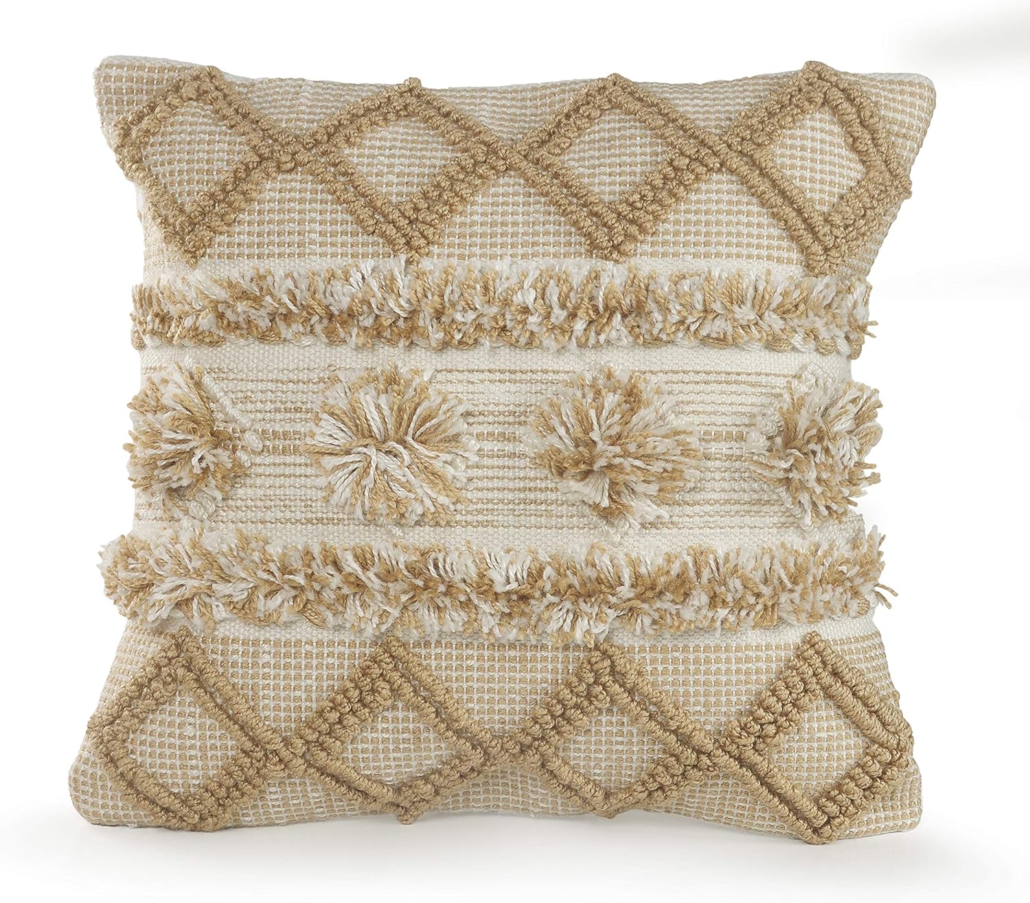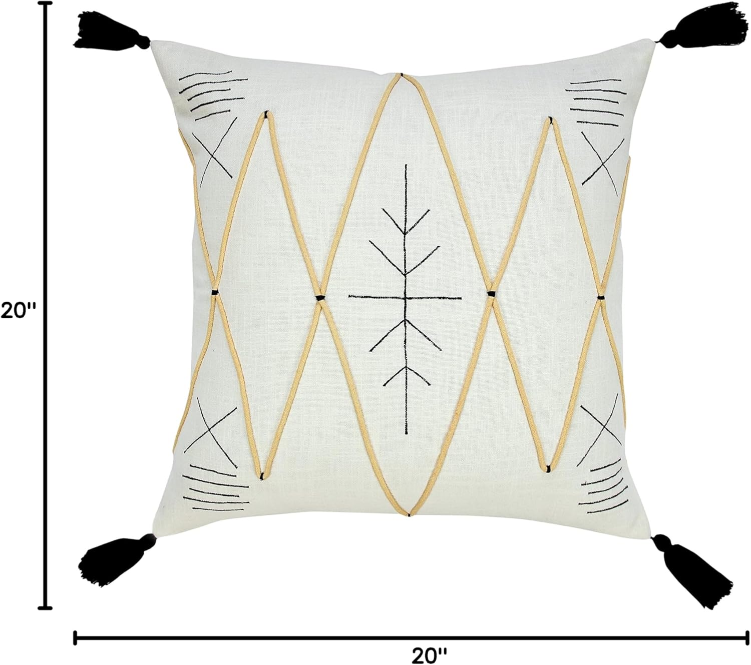 Designed with a balance of leisure and luxury in mind, this neutral embroidered accent pillow merges well with multiple decor styles from modern to traditional to bohemian. This versatile tribal pillow is a detailed statement piece with its basic linen backdrop, intricate embroidery, and finished with a decorative geometric welted piping design. Set a fashionable foundation while maintaining philosophies of affordability and hand-crafted quality.