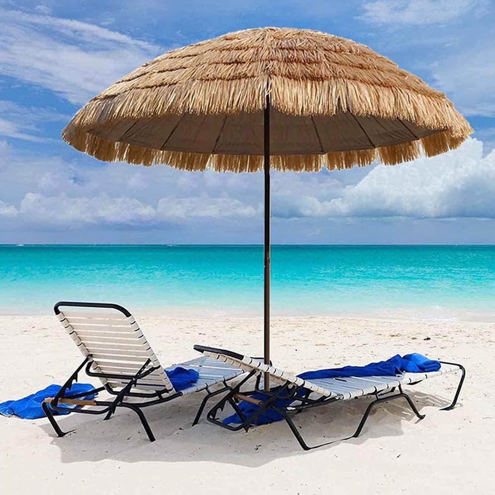!!> Hawaiian style umbrellas are scattered with South China Sea style, which is best choice for your vacation.> > Product Name: Beach Umbrella > Product size: Umbrella height: 2m (6.5 feet) > Diameter under umbrella: 1.8m (6ft) > Product color: natural color > Material: highly simulated PP grass + sunscreen base cloth > Function: tiltable, height adjustable, ventilated, waterproof, sun-proof, windproof > ( umbrella base is not included in umbrella)> What's in package> Beach umbrella* 1> Steering method: pull up pull ring on umbrella pole to make it rotate > Fixing method: pull tab upwards. When putting umbrella into lower pole, please do not put umbrella too low, so as not to get stuck in steering gear. Press down firmly to secure tab.> Creative : Our control umbrella has an adjustable function, which can easily point to angle of sun, covering your area throughout day> Application: balcony, garden, beach, swimming pool, terrace, beach, camping, umbrella, hotel, outdoor activities and travel.{/p}
